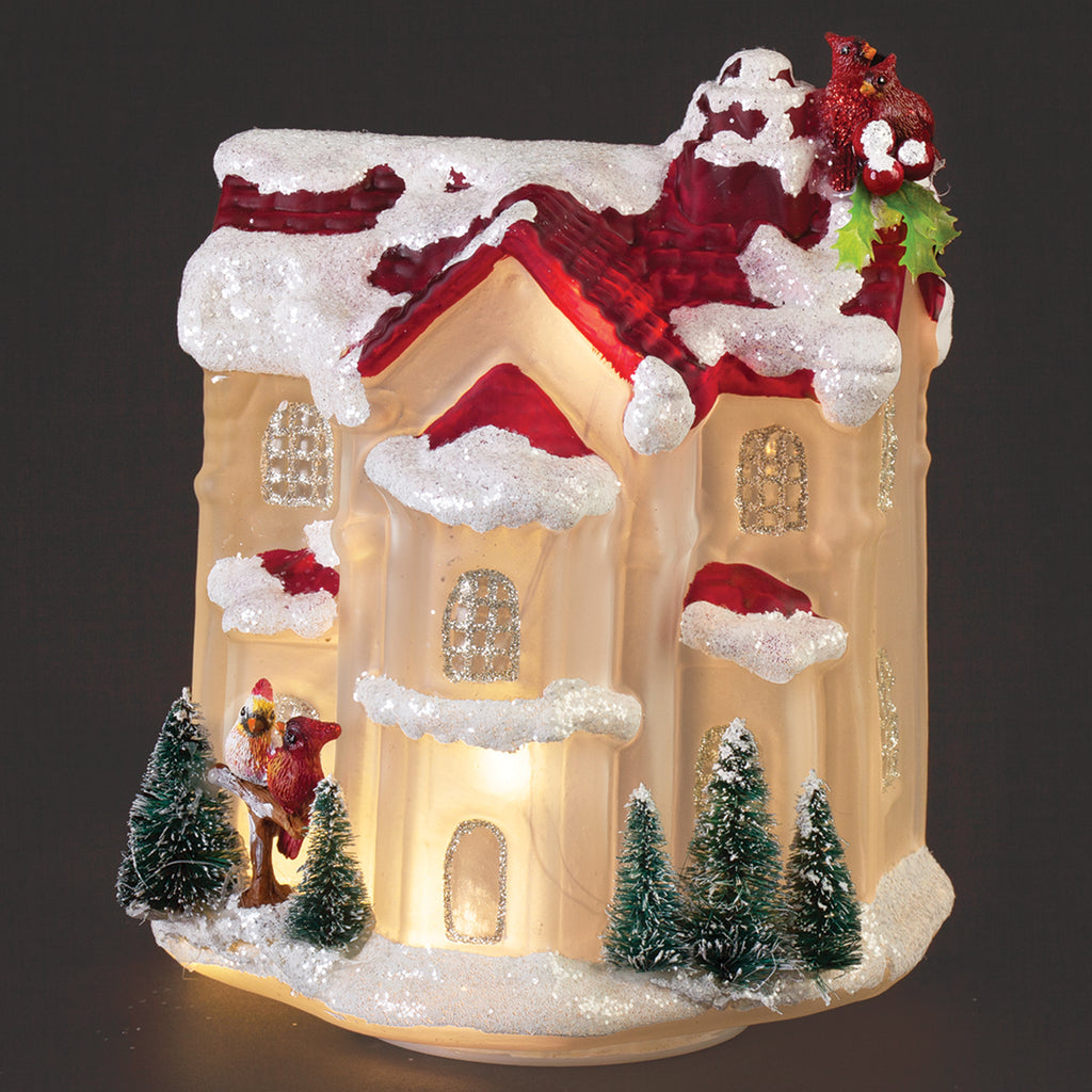 Brighten your holiday display with this lighted glass house, beautifully decorated with vibrant cardinals. The soft, glowing light creates a cozy ambiance, making it a delightful addition to mantels, shelves, or seasonal vignettes.