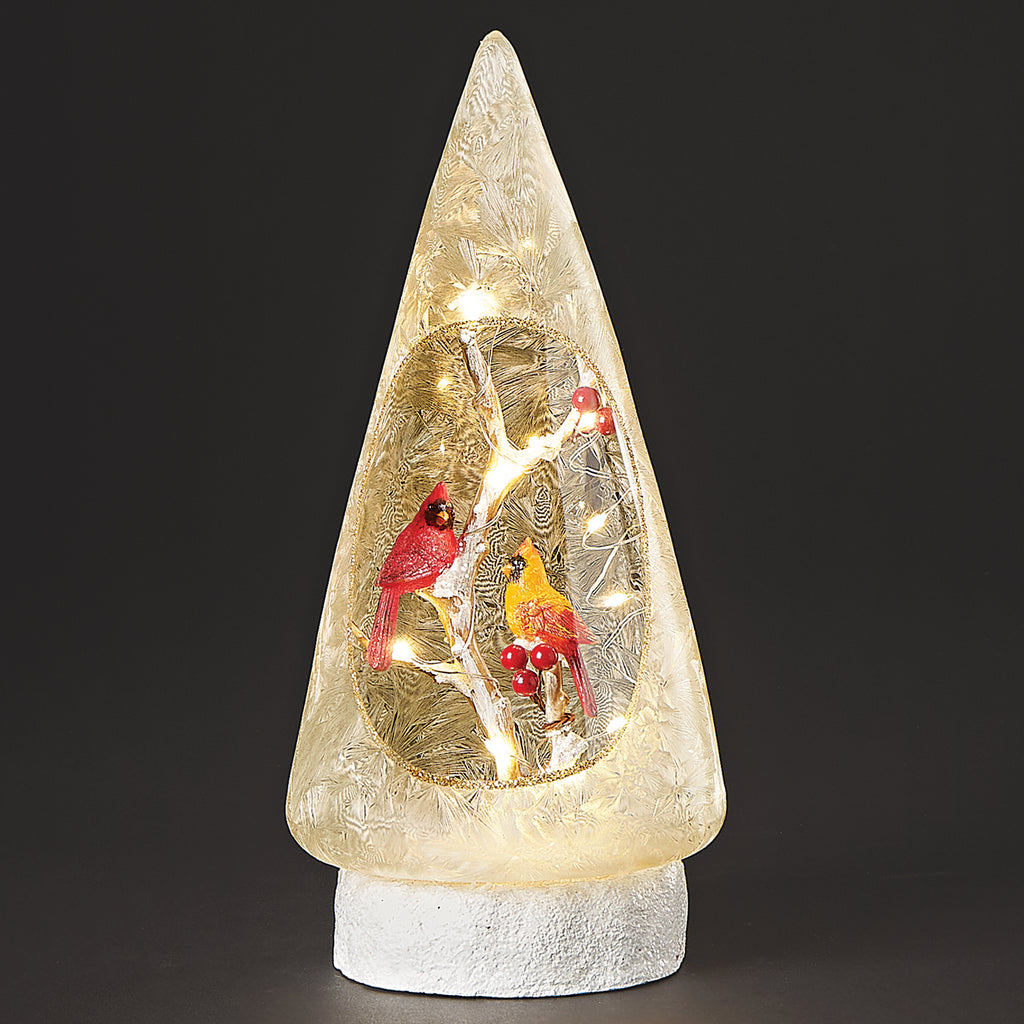 Illuminate your seasonal display with this lighted glass tree, beautifully adorned with holly and a pair of vivid cardinals inside. The glowing interior brings warmth and charm, making it a perfect addition to mantels, tabletops, or nature-inspired holiday themes.