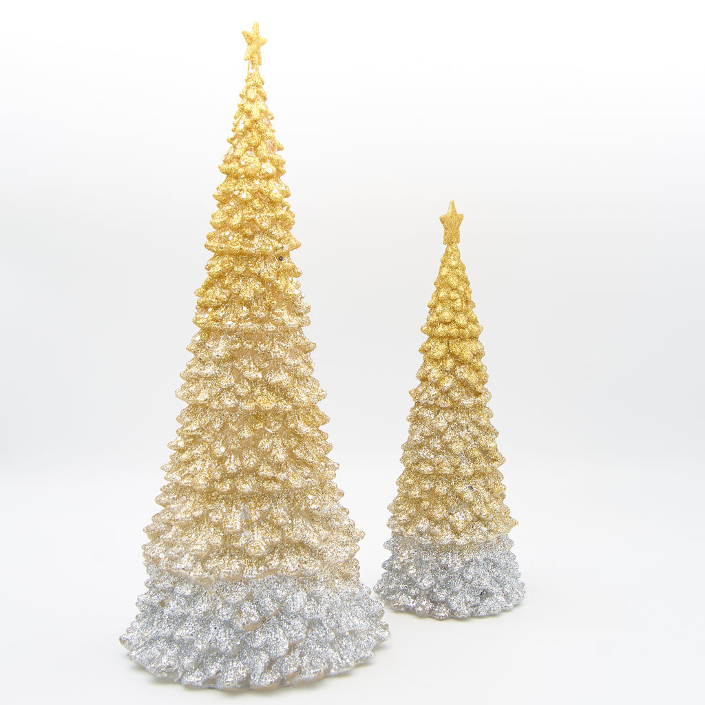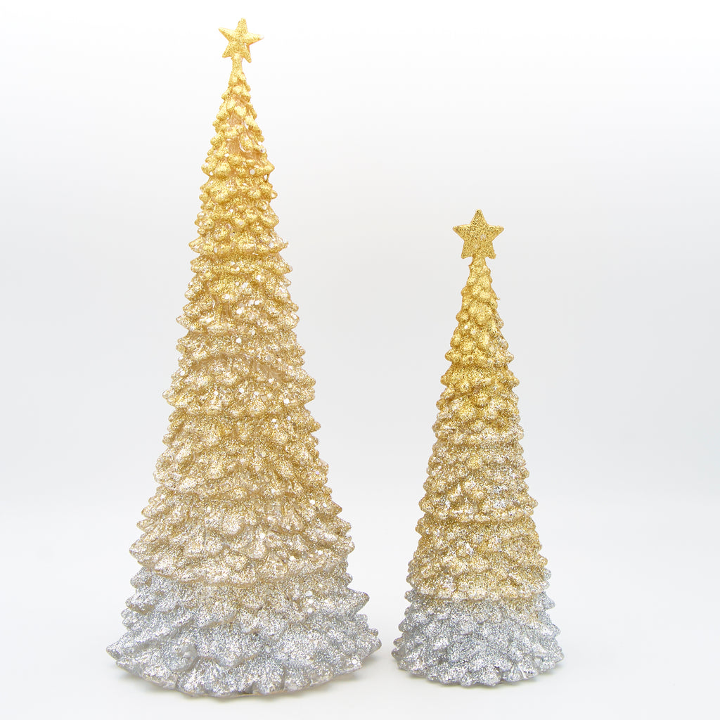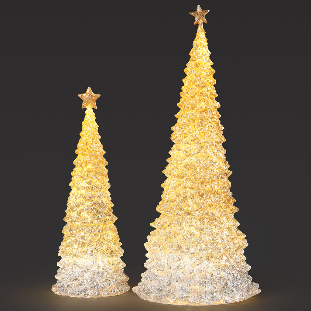 Bring glowing elegance to your holiday décor with this 2-piece set of lighted gold ombre glitter trees. Each tree features a stunning gold-to-clear ombre finish that sparkles beautifully when illuminated. Topped with a shimmering gold star, this set includes two trees—perfect for tabletops, mantels, or as part of a festive centerpiece.