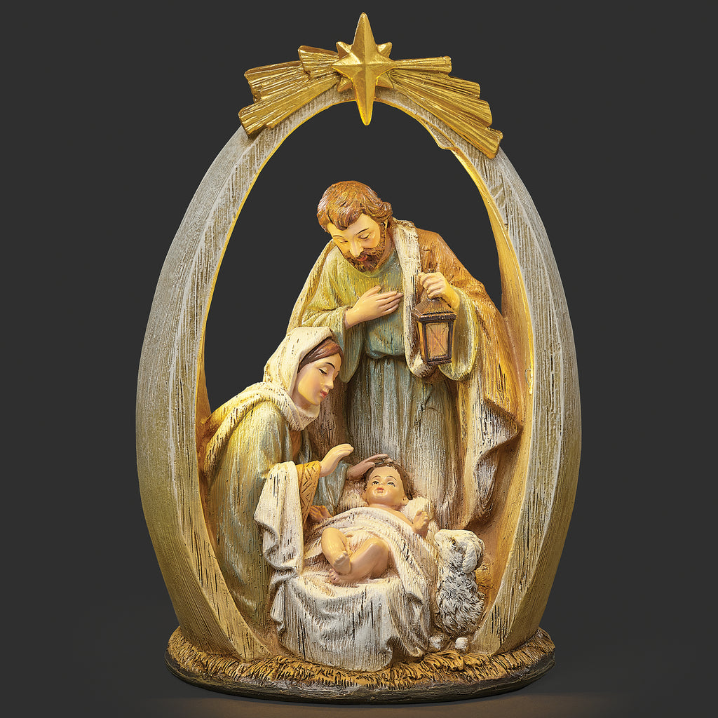 Bring warmth and reverence to your Christmas décor with this lighted Holy Family scene. Framed by a sculpted arch with the look of carved wood and crowned by a gracefully curving star, it softly illuminates Baby Jesus, Mary, and Joseph. The warm glow enhances the gold-toned highlights and gentle textures, making it a radiant centerpiece for mantels or shelves.