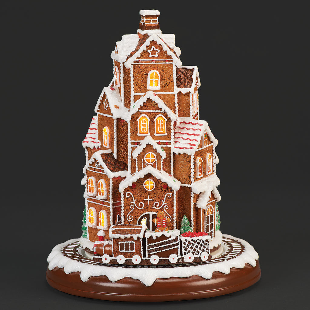 Delight in the wonder of the season with this intricately designed gingerbread tower, glowing with warm light from its festive windows. A cheerful train circles the base, rotating through the sugary landscape to create movement and charm. Complete with holiday melodies, this musical centerpiece captures the sweetness and joy of Christmas, making it a perfect addition to mantels, tabletops, or holiday villages.