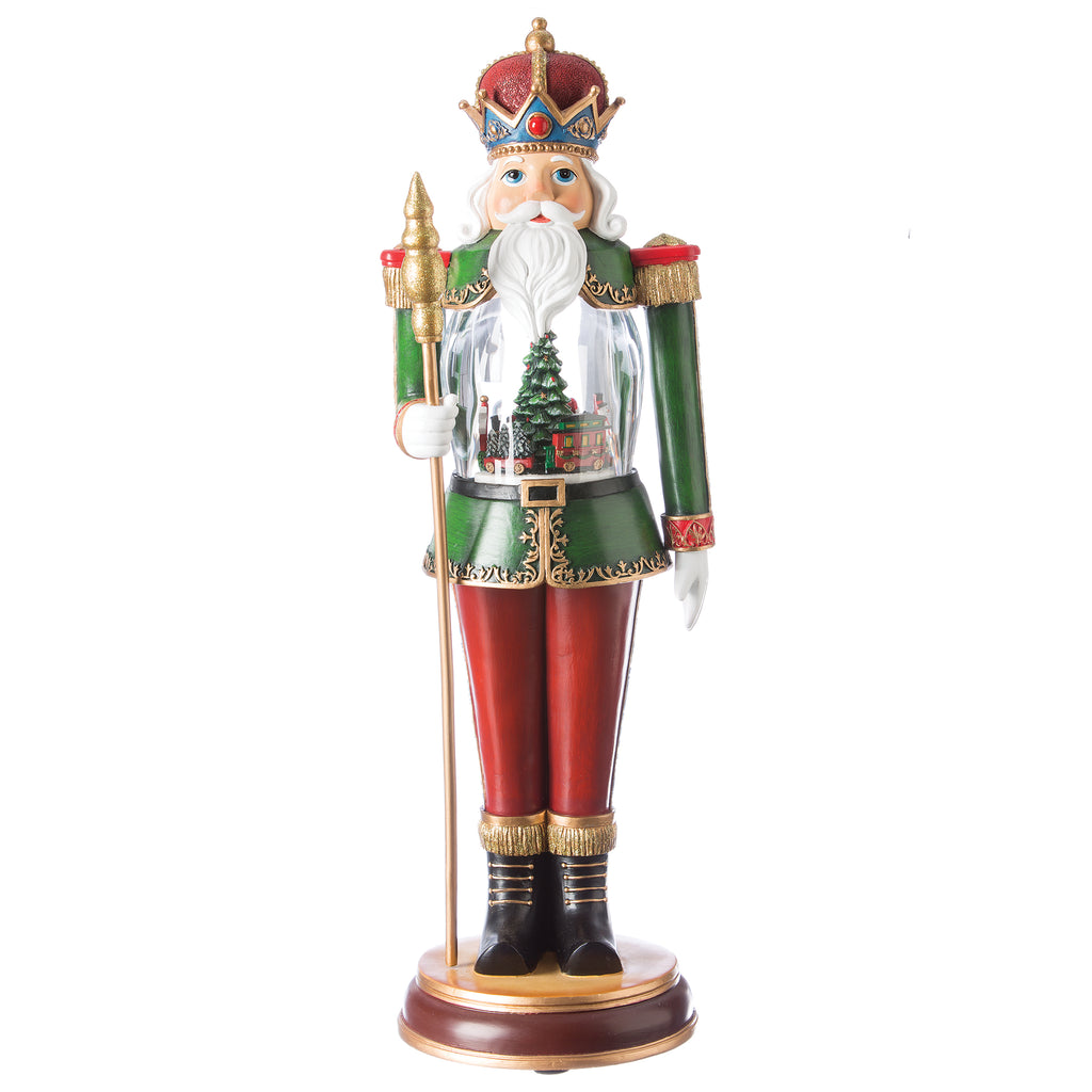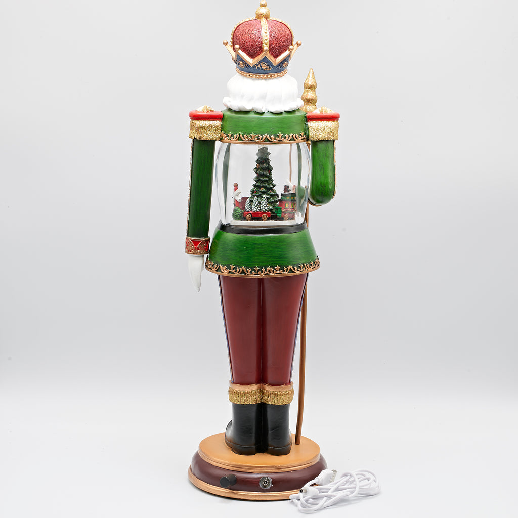Standing tall, this captivating nutcracker embodies holiday magic with intricate, ornate details. Inside its clear, illuminated center, a festive train rotates in graceful motion, adding lively charm to your decor. Perfect as a musical centerpiece for mantels, entryways, or beneath the tree, this enchanting piece brings warmth, movement, and seasonal cheer to any space.