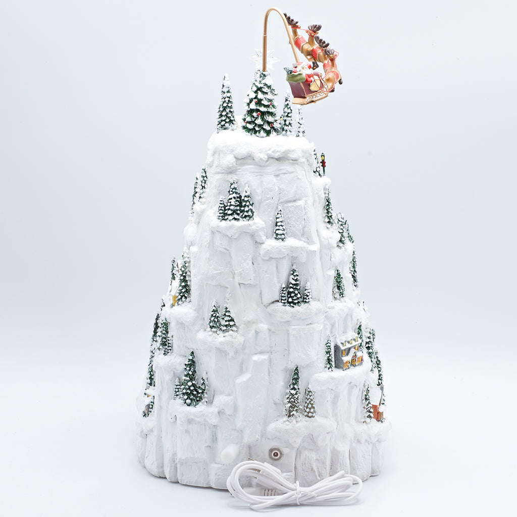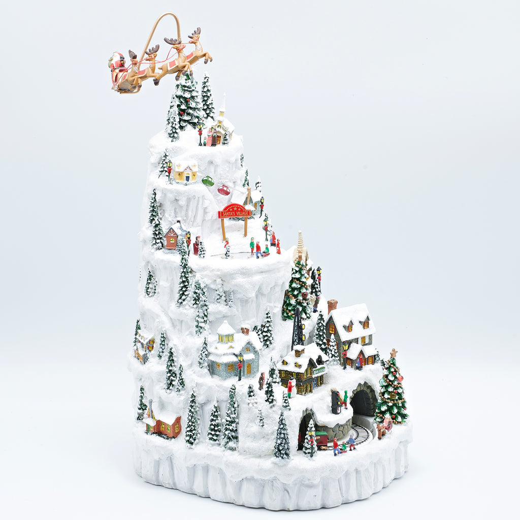 This Christmas mountain village captures the magic of the season with glowing homes, ice skaters, snowy trees, and festive details tucked into every layer. A rotating train winds its way through a tunnel at the base while Santa’s sleigh soars in a graceful circle above, bringing the whole scene to life. Illuminated windows and joyful holiday music complete this enchanting piece, making it a captivating centerpiece that celebrates the wonder of Christmas.