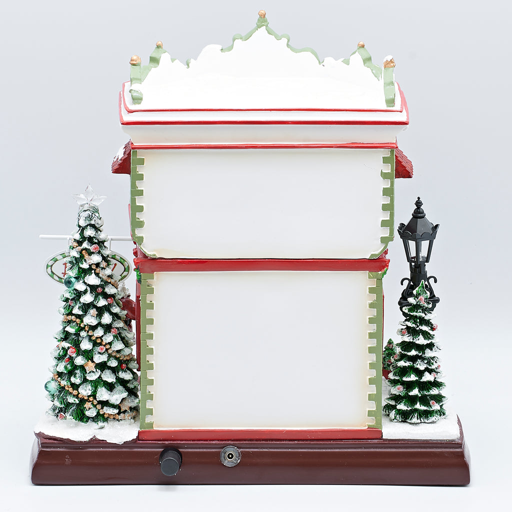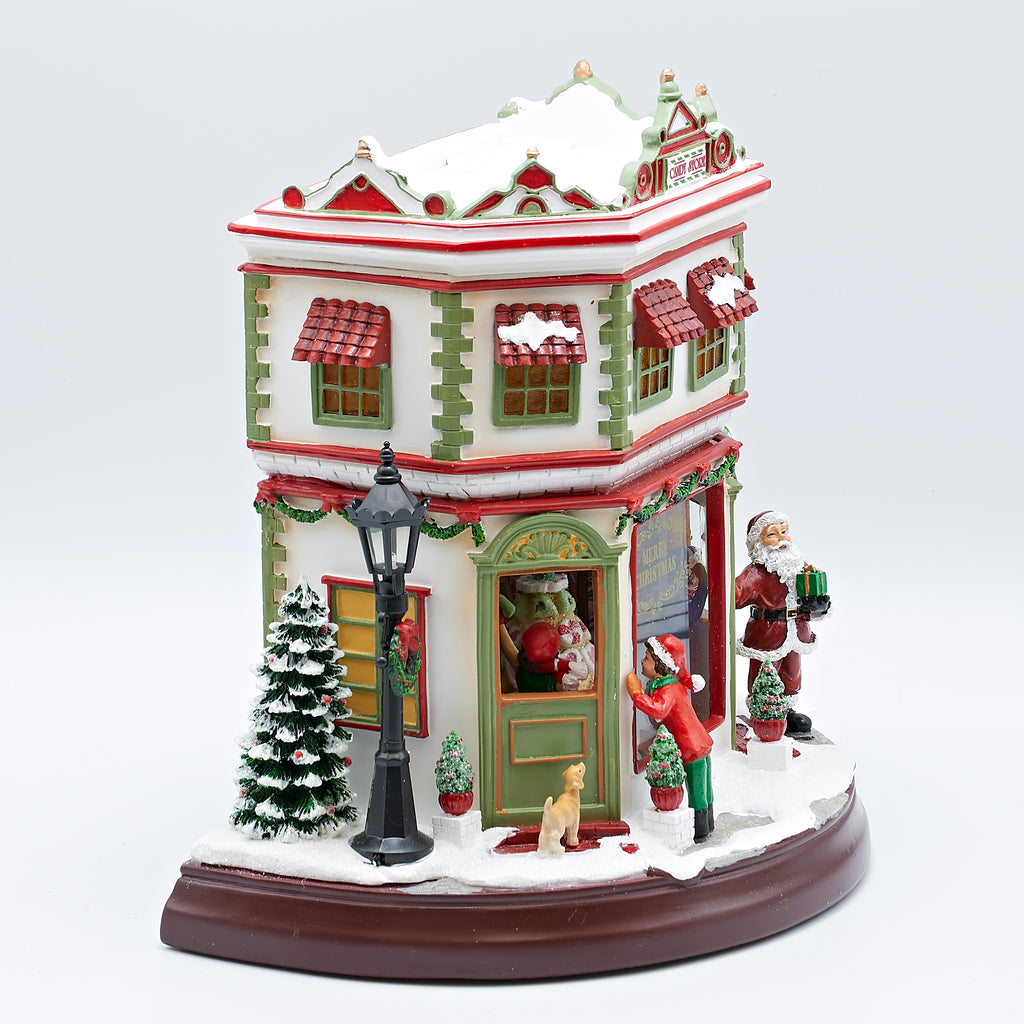 Sweeten your holiday village with this festive Candy Store and Bakery scene. Trimmed in red and green with snowy rooftops and garlands, the storefront windows glow to reveal holiday treats inside. Outside, Santa greets visitors while a lamp post, Christmas tree, and cheerful figures add to the charm. With its inviting details and warm light, this piece captures the magic of Christmas time and makes a delightful addition to any Christmas village collection.