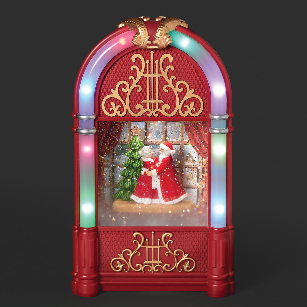 Turn up the holiday fun with this festive lighted swirl jukebox. Santa and Mrs. Claus dance joyfully as glitter swirls in the glow of warm light, all framed by a retro jukebox design. A lively accent that combines nostalgic style with holiday cheer, it’s perfect for mantels, shelves, or seasonal displays.