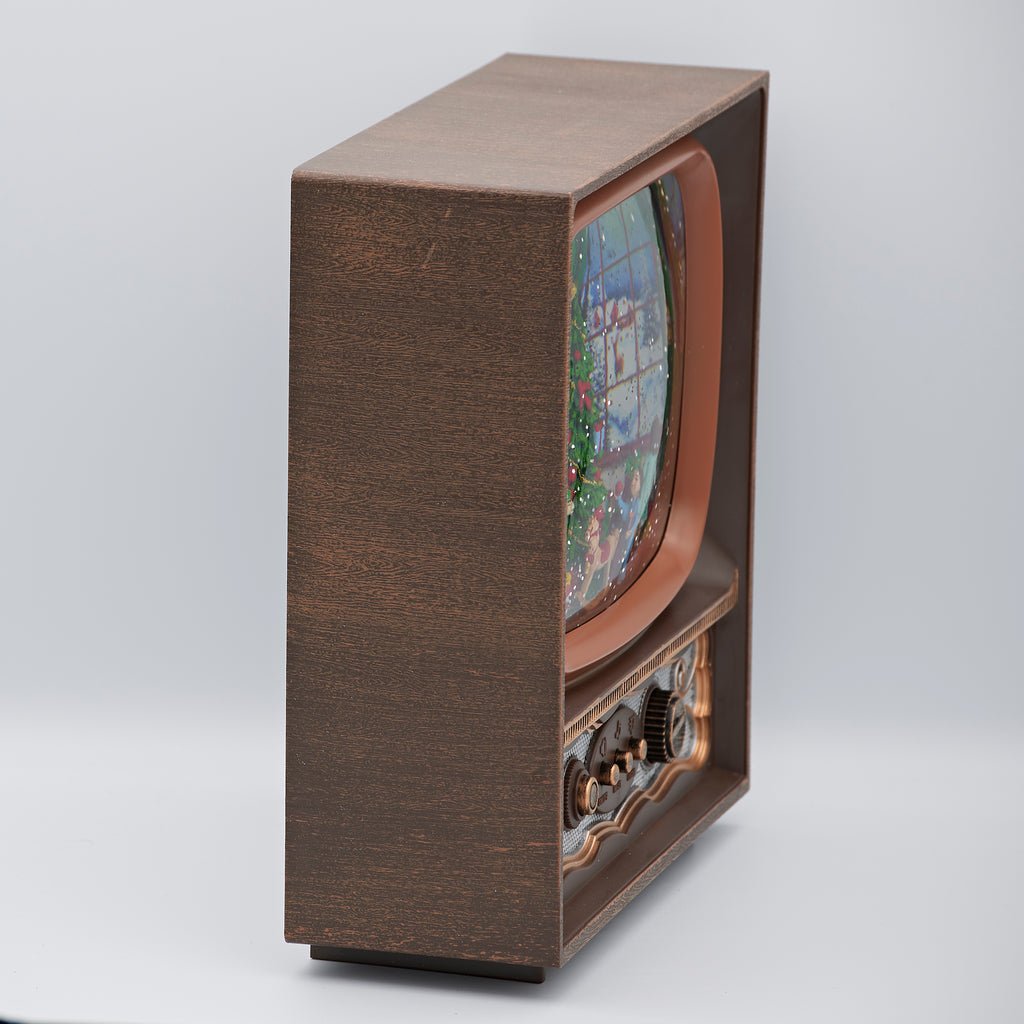 Bring holiday nostalgia to life with this charming lighted musical swirl TV. Inside, Santa is joined by children in a festive scene as swirling glitter sparkles in the glow of warm lights. Playing classic Christmas tunes, this nostalgic piece fills your home with joy and warmth, making it a perfect addition to mantels, shelves, or holiday displays.
