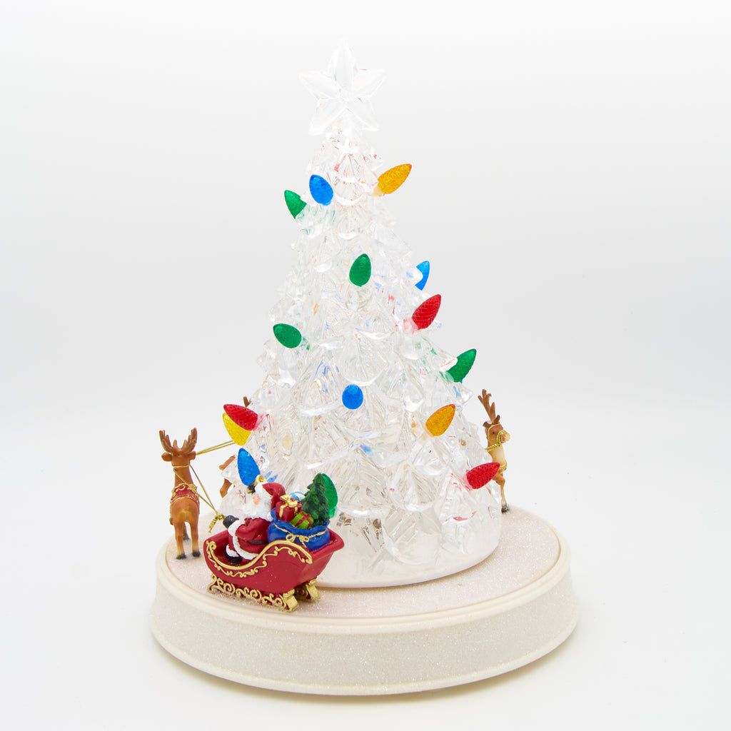 Watch the wonder unfold with this lighted musical Christmas tree, featuring Santa and his reindeer rotating around the base. The glowing lights and cheerful music bring the scene to life, making it a joyful centerpiece for your holiday décor. With intricate details and a heartwarming design, it’s perfect for adding seasonal charm to your mantel, entryway, or tabletop display.