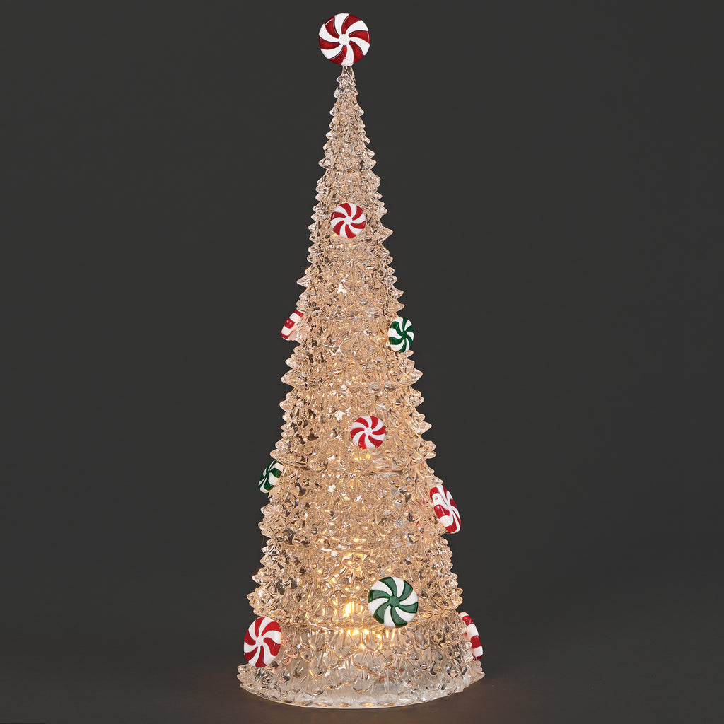 Brighten your holiday décor with this sparkling peppermint candy tree, accented with candy-inspired details and glowing with warm white light. Its shimmering design captures the sweetness of the season, making it an eye-catching centerpiece or a festive tabletop accent. Perfect for holiday parties, dining tables, or seasonal displays, this piece adds a cheerful and whimsical touch to any space.
