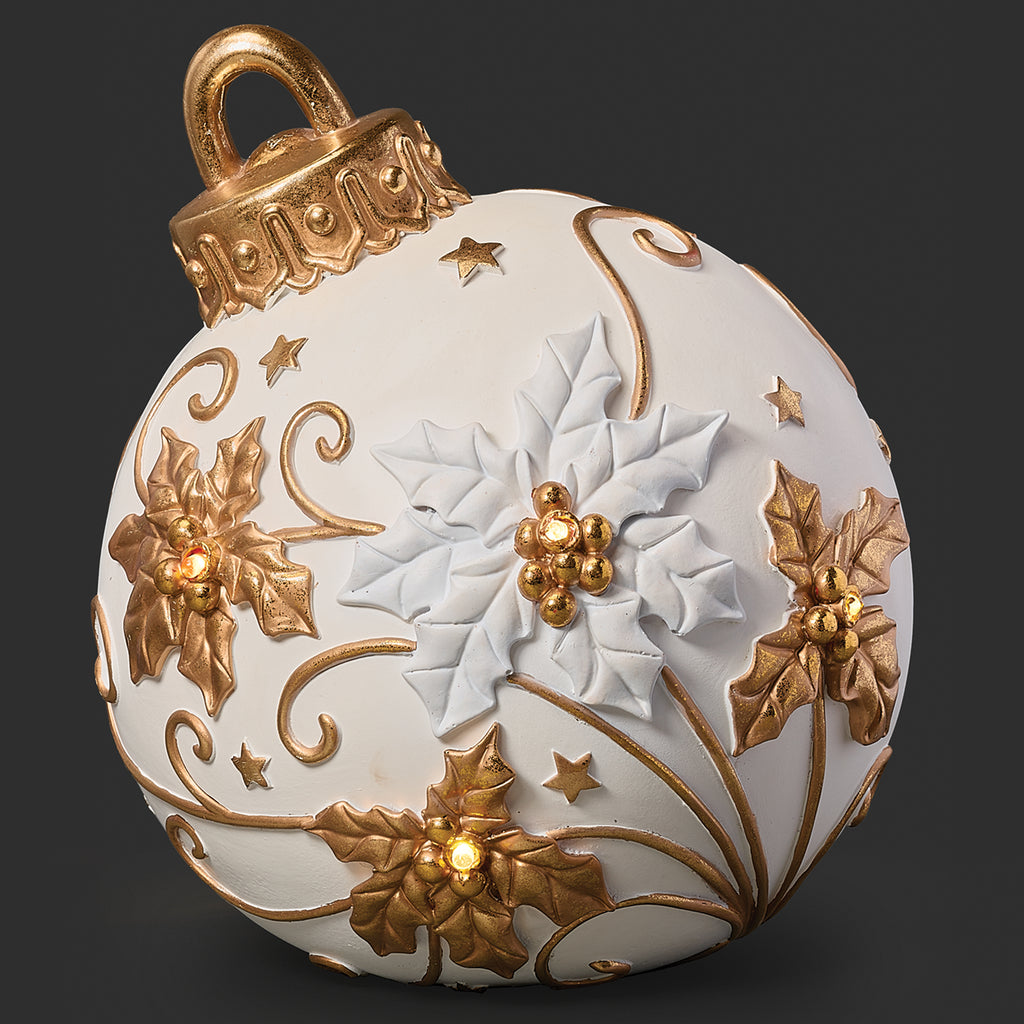 This lighted ornament figure shines with timeless holiday elegance, featuring raised poinsettia blossoms and holly leaves in shimmering white and gold. Golden stars and graceful scrollwork wrap around the design, while warm LED lights glow from the floral centers, adding a touch of radiance. The ornament’s sculpted details and luminous finish create a festive display piece that captures the beauty and joy of the Christmas season.