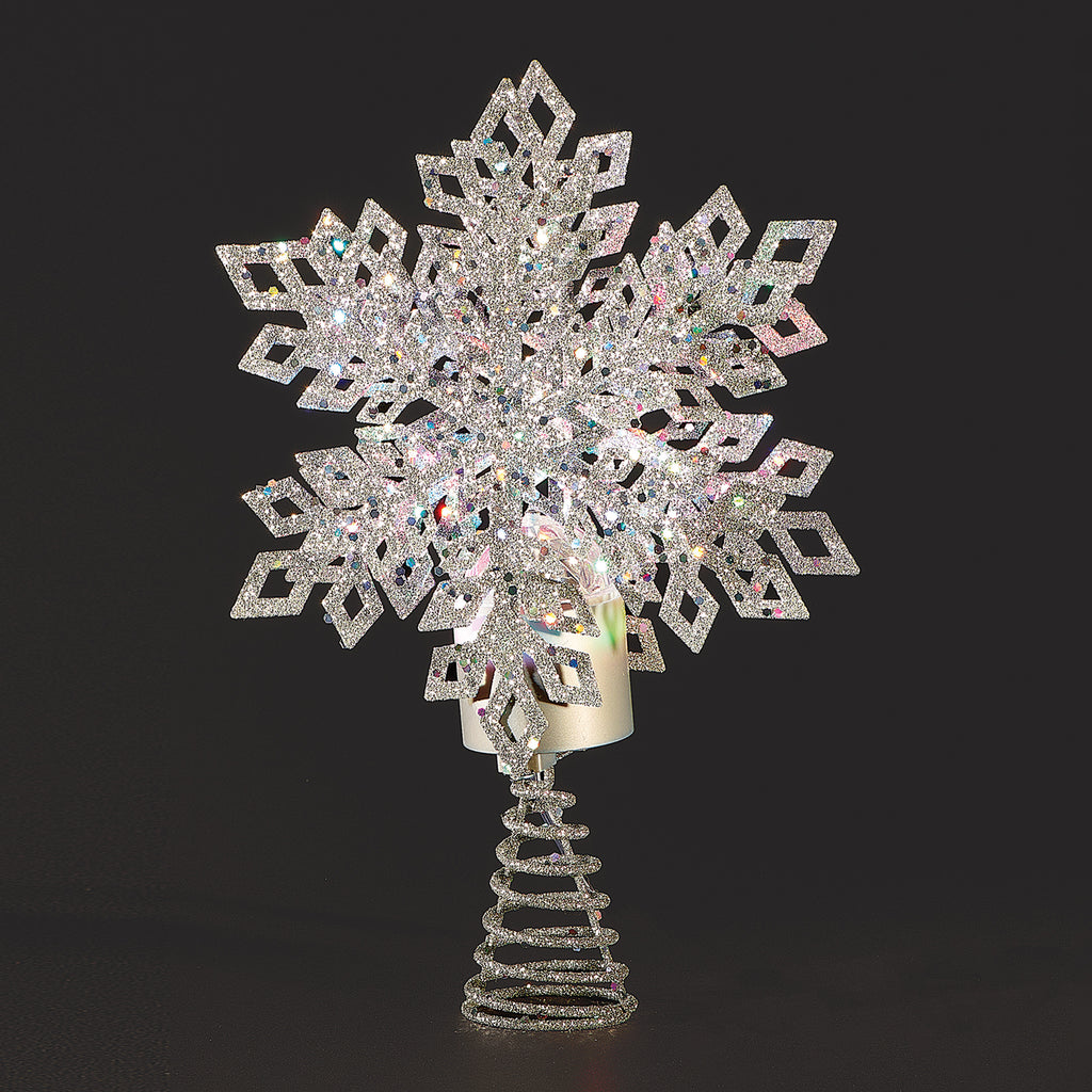 Add sparkle and movement to your Christmas tree with this dazzling silver snowflake treetopper. Featuring rotating tri-color lights that cast a beautiful glow onto the ceiling, it creates effortless holiday magic, turning your tree into a stunning focal point filled with shimmer and festive charm.