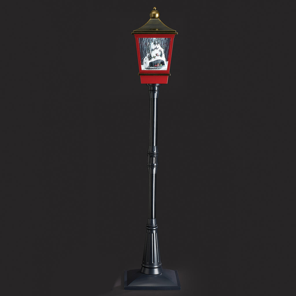 This snowing mountain lamppost brings motion, music, and magic to your decor. Inside the lantern, artificial snow swirls around a charming mountain scene as a train rotates through. Illuminated from within, this decor piece is perfect for entryways, large rooms, or retail holiday displays.