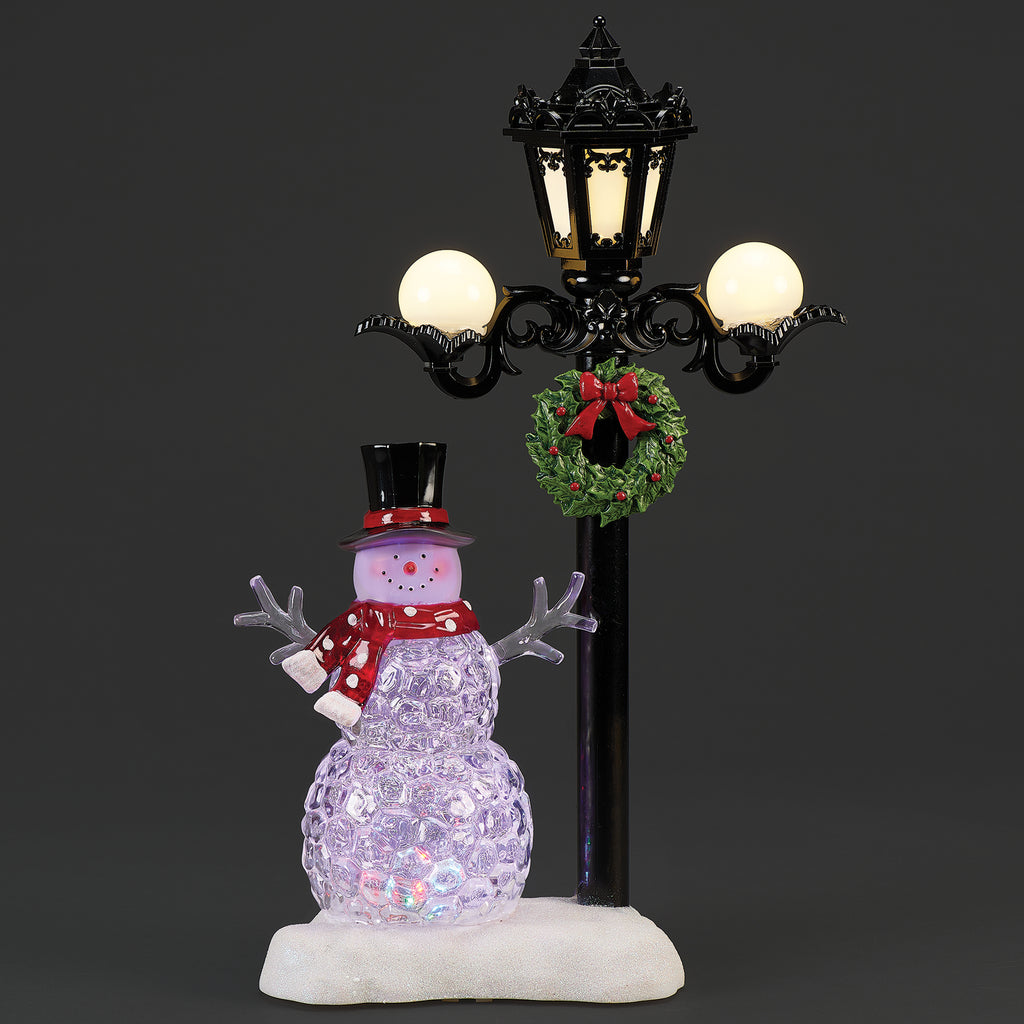 Brighten your holiday display with this charming lighted snowman lamppost. Featuring a cheerful snowman and a classic black lamppost, the piece glows with soft white light for a festive, magical effect. It adds a nostalgic and playful touch to your seasonal décor.