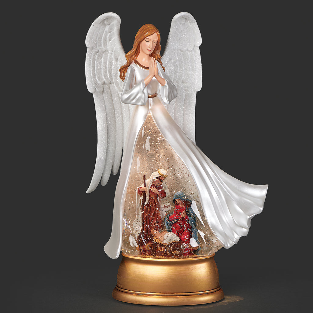 This lighted swirl angel lovingly surrounds the Holy Family in a scene of peace and reverence. Illuminated with swirling glitter, it adds spiritual beauty and grace to your holiday decor.