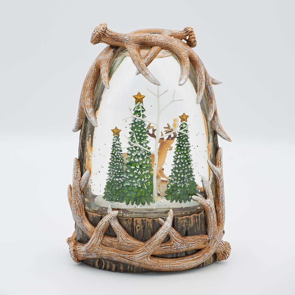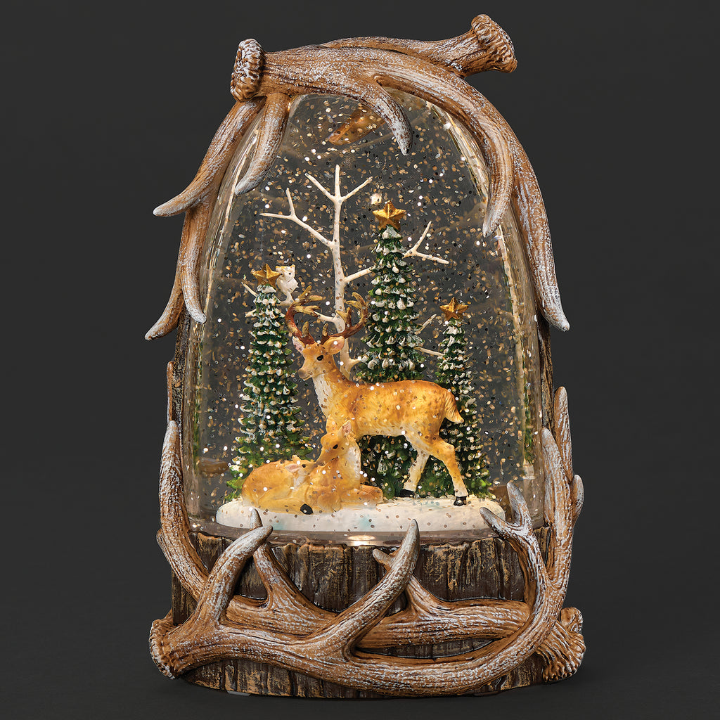 Bring rustic charm to your holiday decor with this lighted swirl display. Nestled in antler-shaped casing, a serene deer family is surrounded by swirling glitter and forest trees.