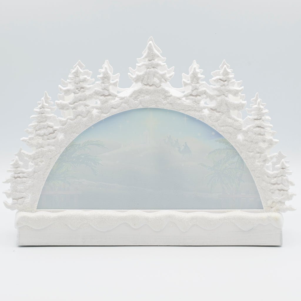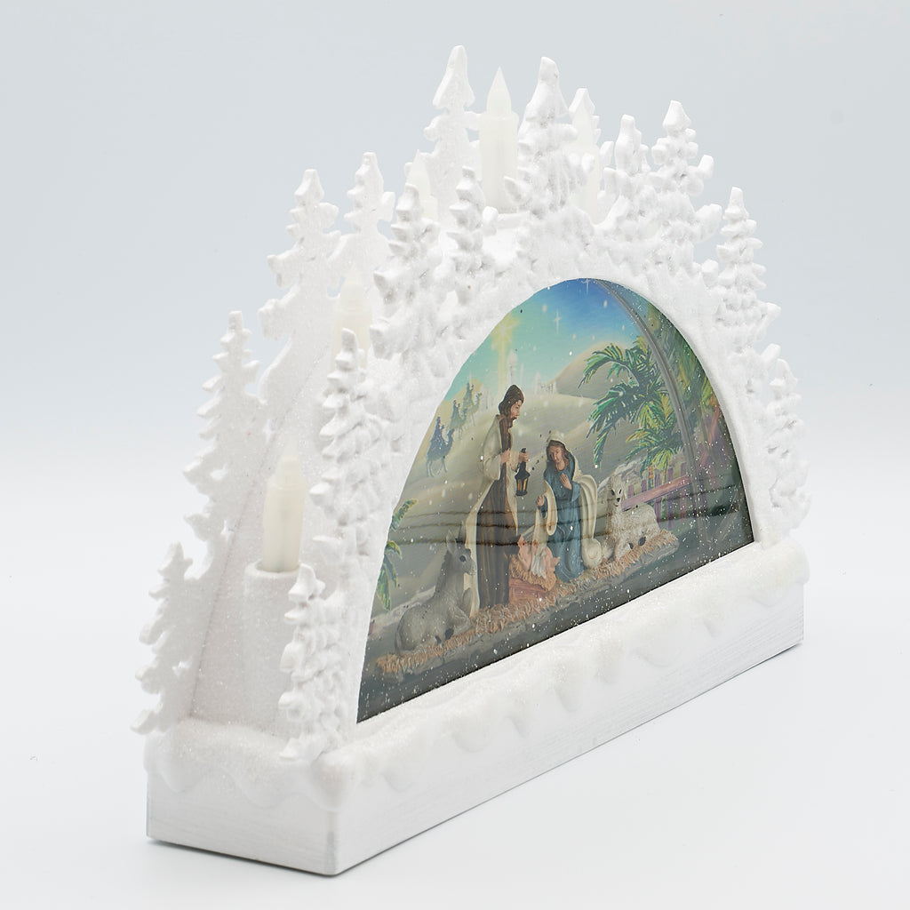 This lighted swirl arch features the Holy Family set against a beautifully printed background. Swirling glitter and gentle light enhance the scene, making it a peaceful and meaningful holiday accent.