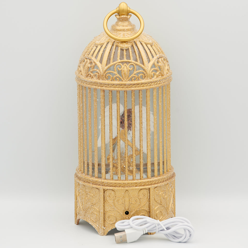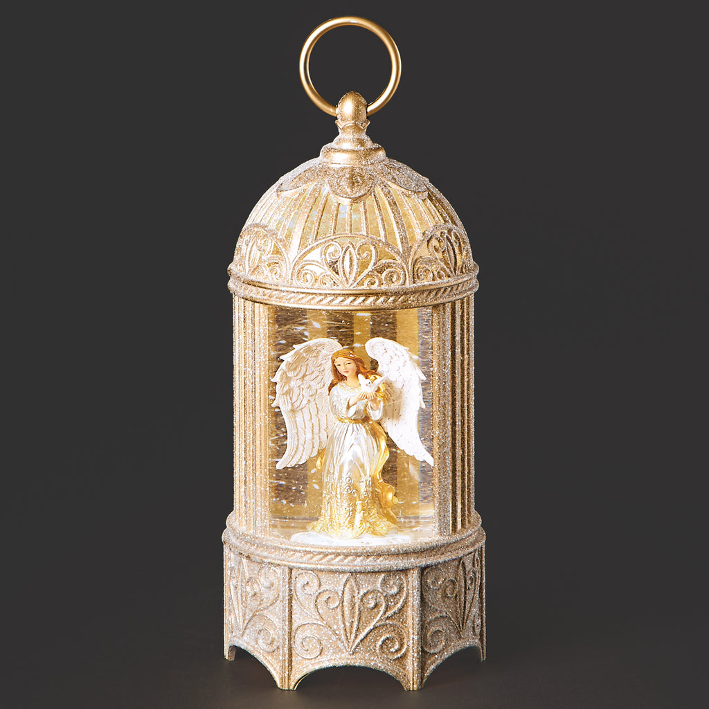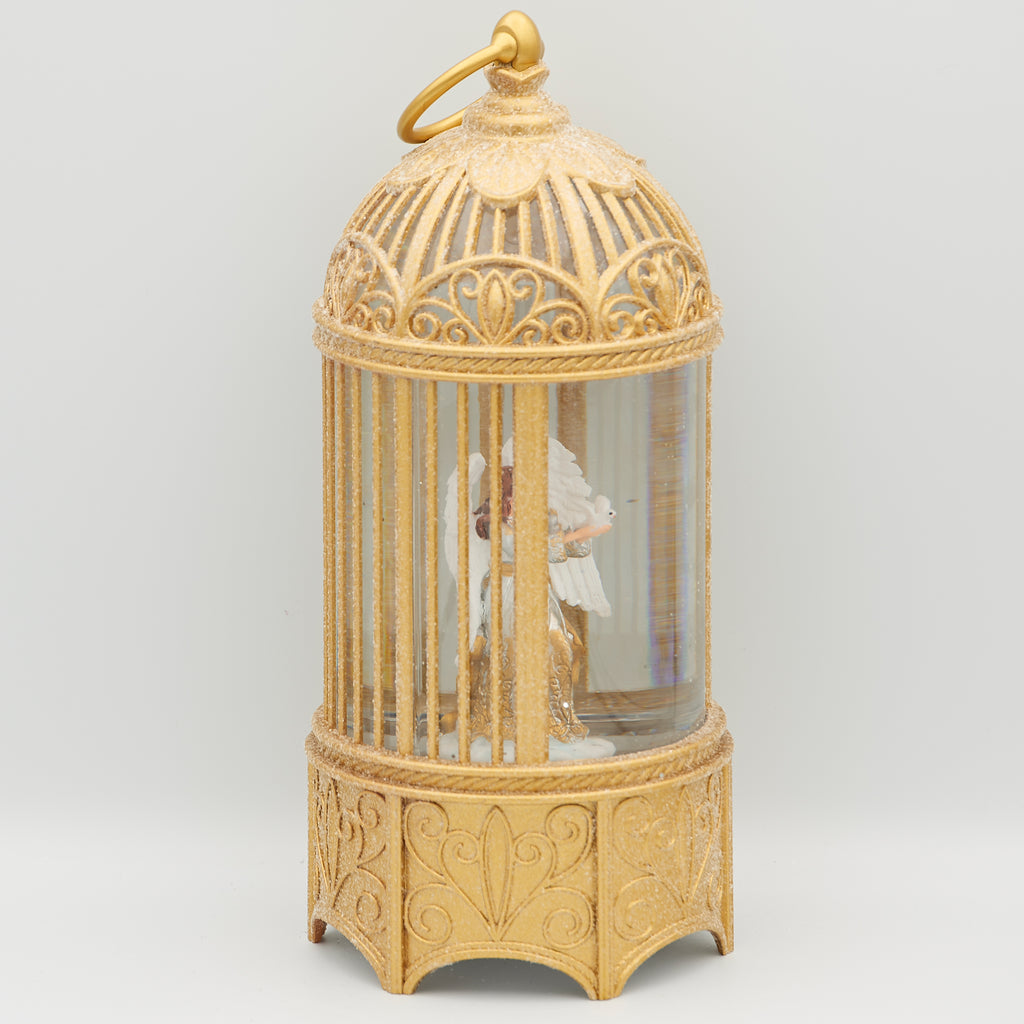 This lighted swirl birdcage features a serene angel with a dove, symbolizing peace and grace. Swirling glitter and warm light create a tranquil and uplifting holiday accent.