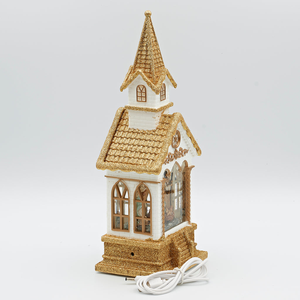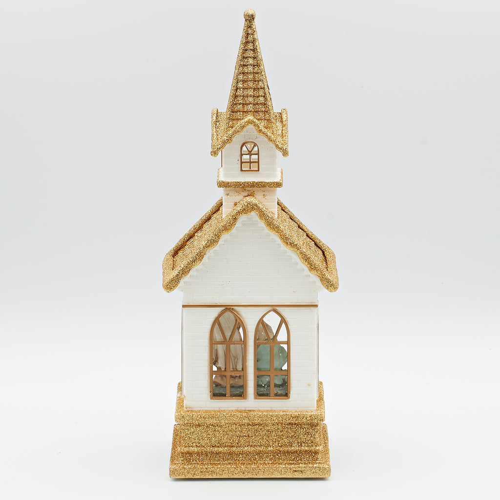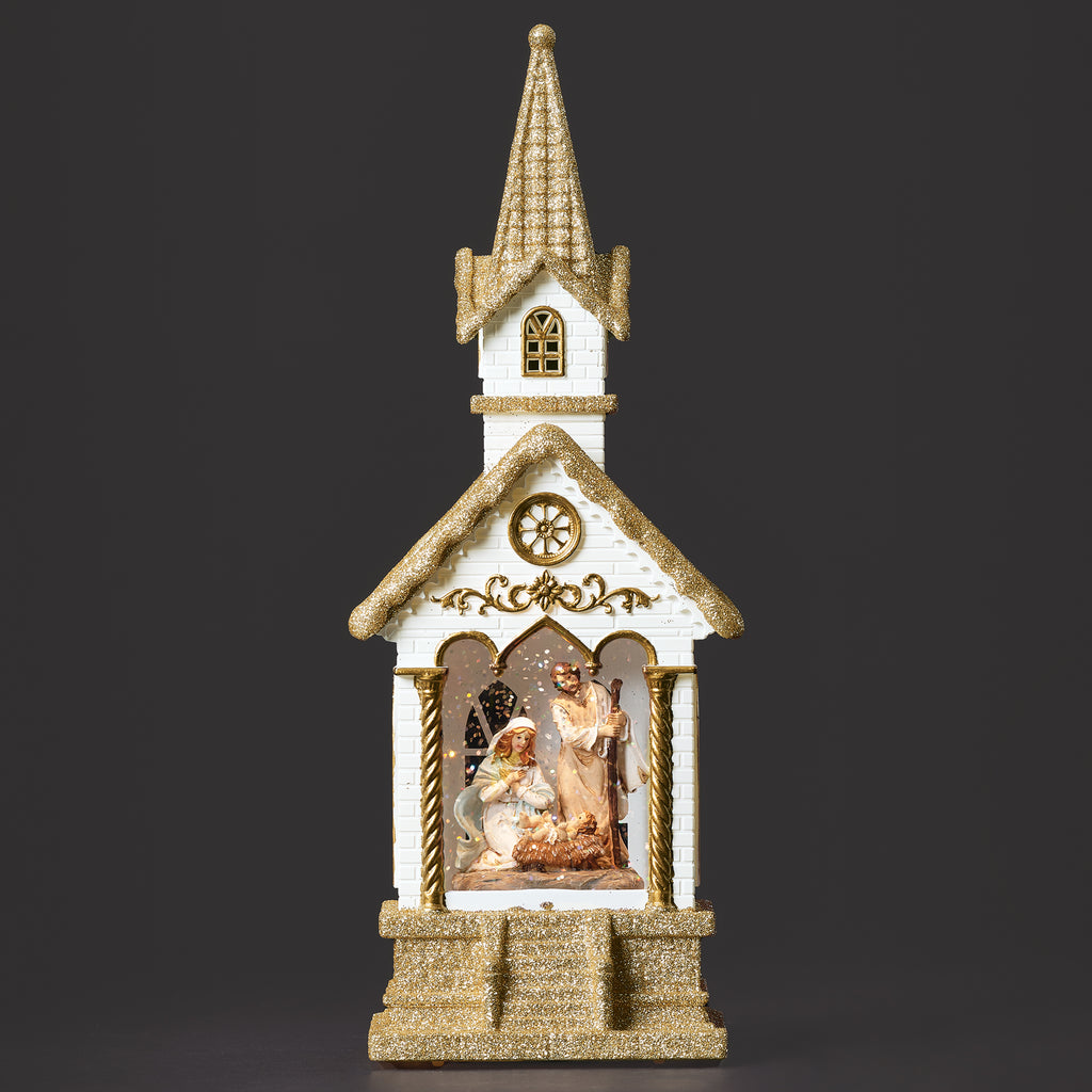 This lighted swirl church showcases the Holy Family in refined white and gold tones. Swirling glitter and soft lighting create a peaceful, radiant centerpiece for any faith-filled holiday display.