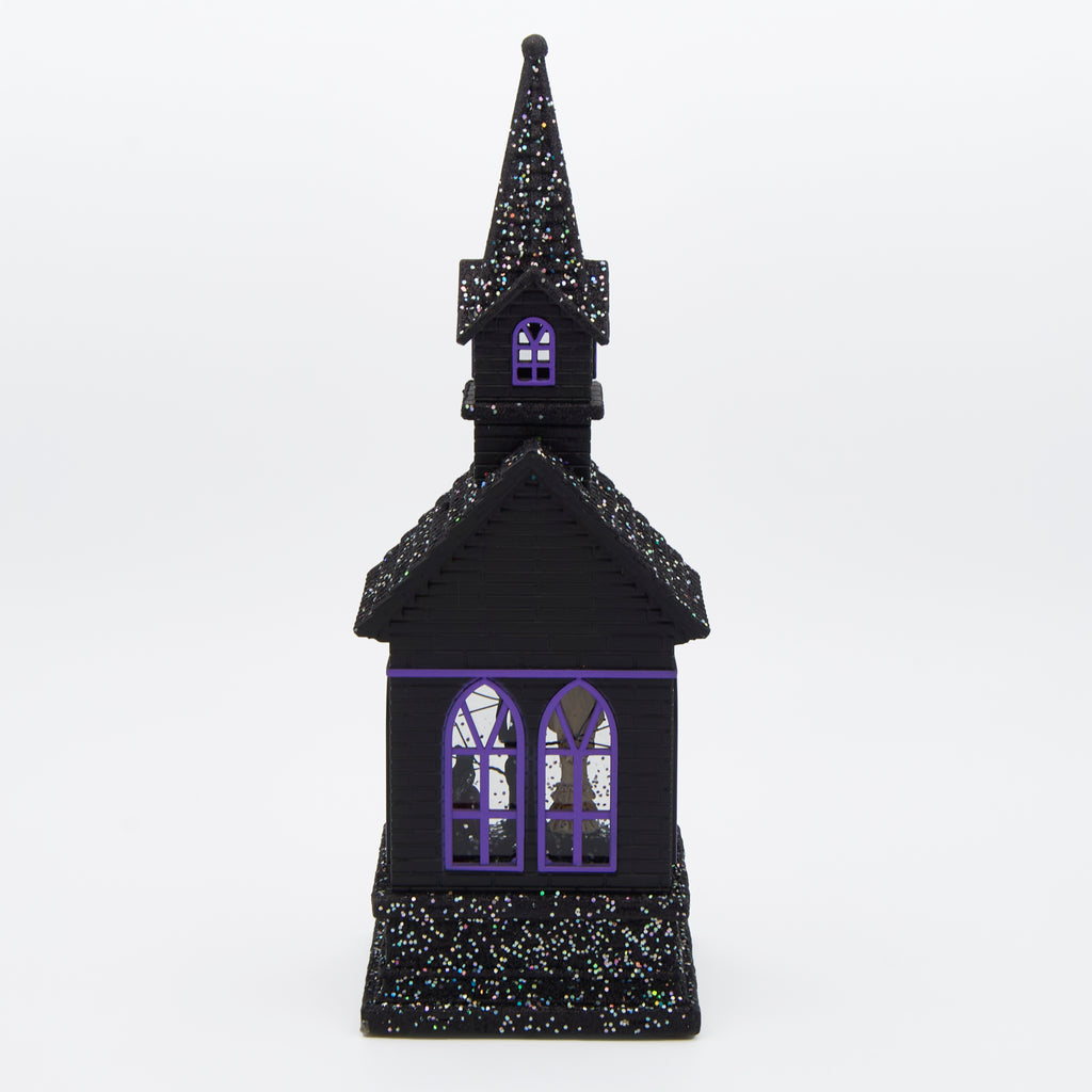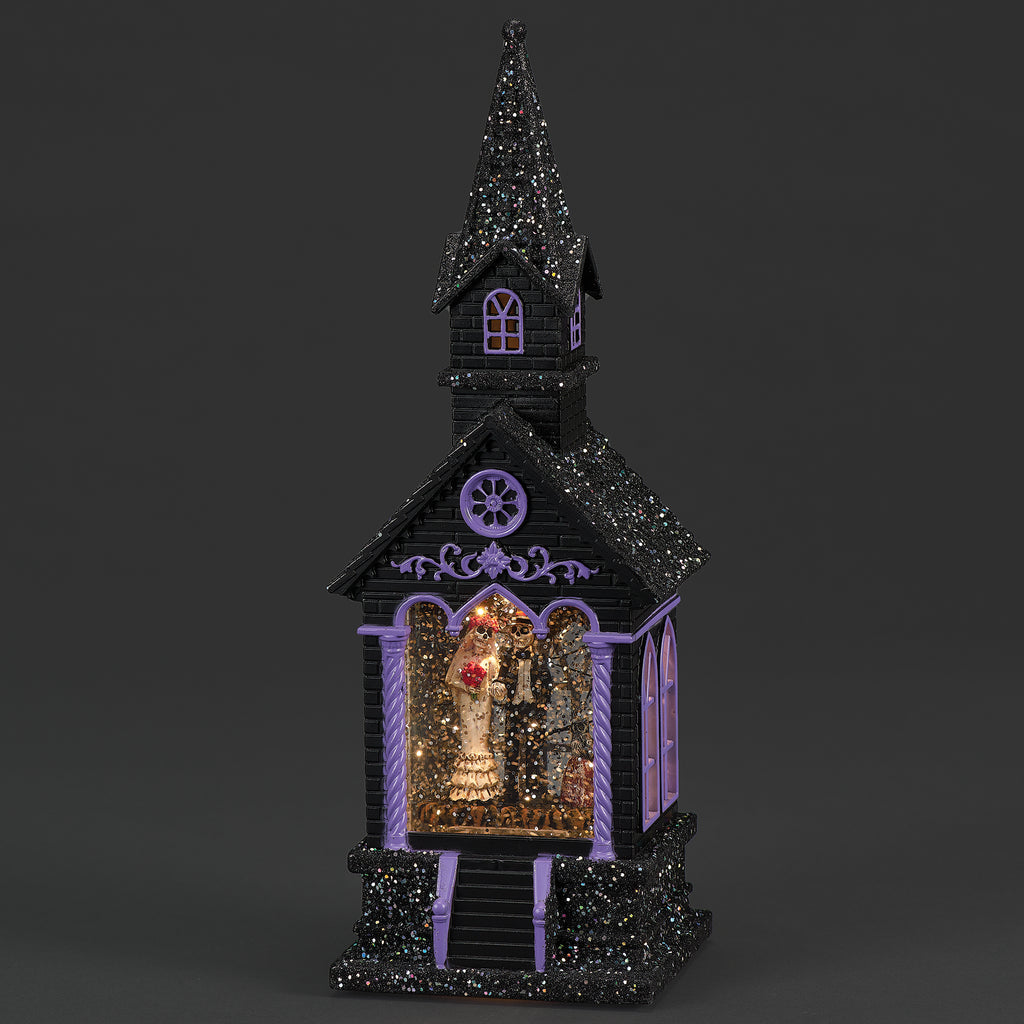 Add eerie elegance to your Halloween décor with this lighted swirl church. Inside, a skeleton bride and groom stand together in haunting romance, surrounded by shimmering black glitter that swirls continuously. Glowing from within, this gothic piece creates the perfect spooky atmosphere. USB or battery powered for versatile display on mantels, shelves, or tabletops.