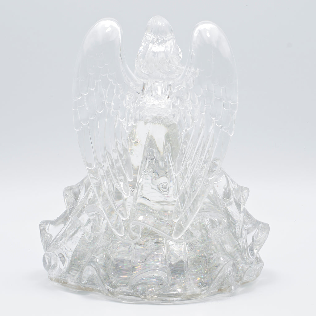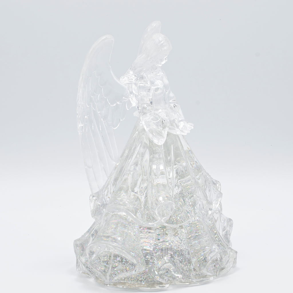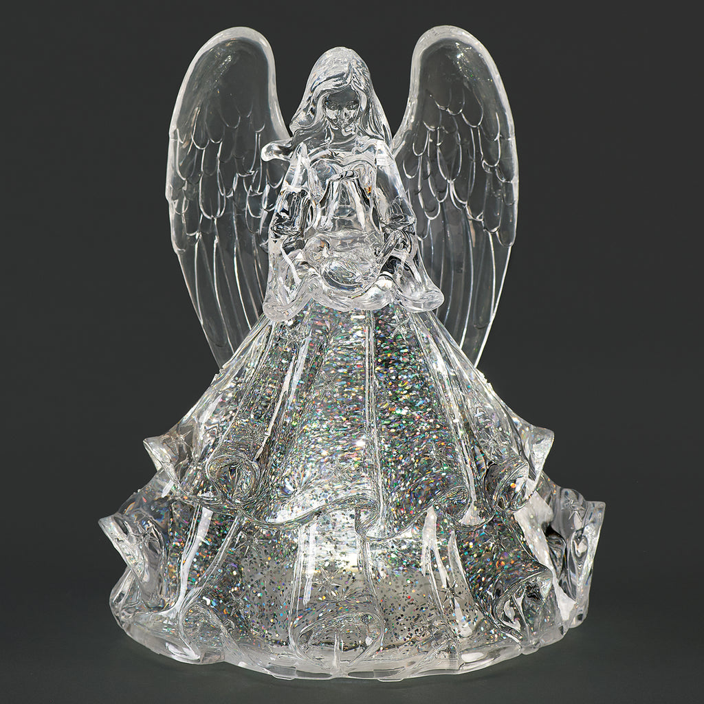 This clear lighted swirl angel features a full flowing skirt and a delicate bird in hand. Swirling glitter and warm illumination create a serene and graceful presence for your holiday or inspirational decor.