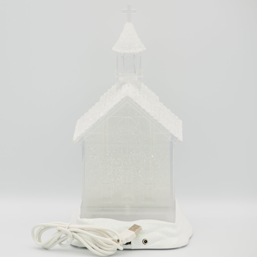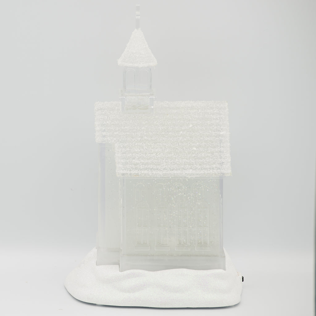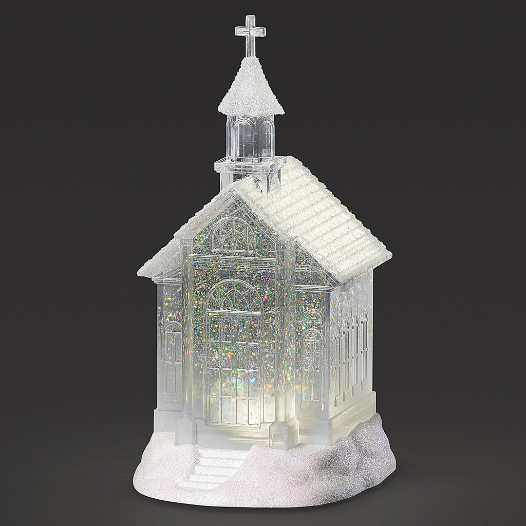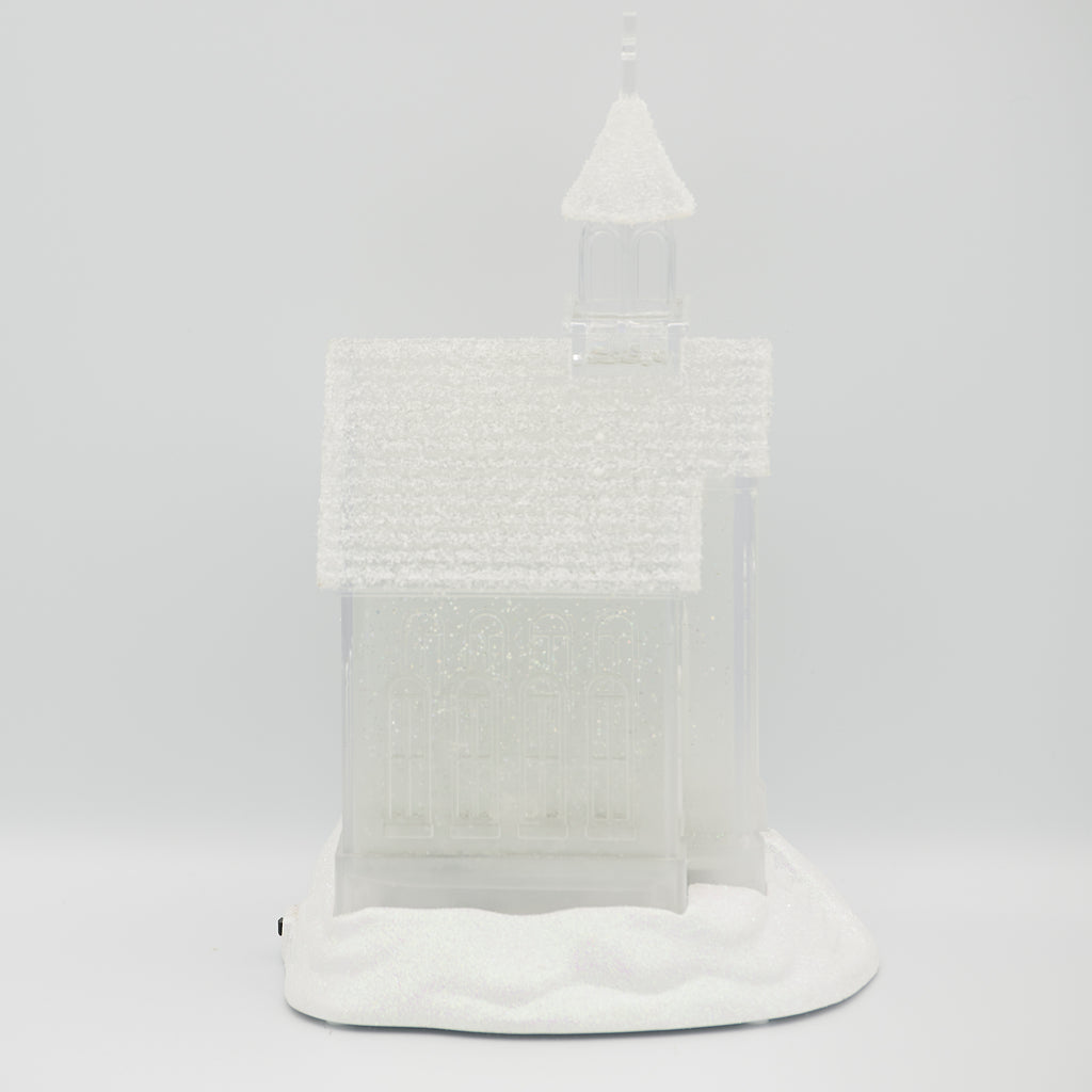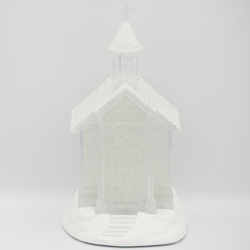 Elegant and luminous, this clear acrylic church sparkles with swirling glitter and a shimmering glittered roof. A beautiful addition to your winter village or holiday display.