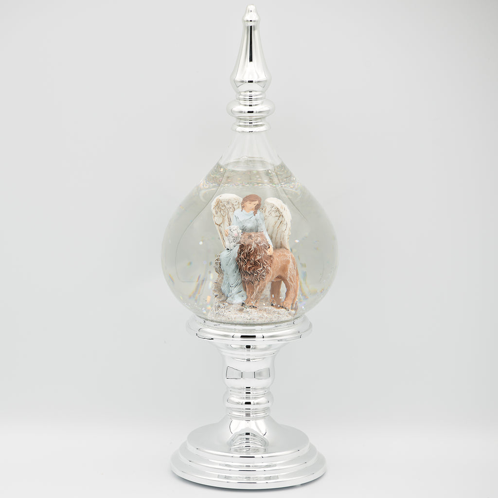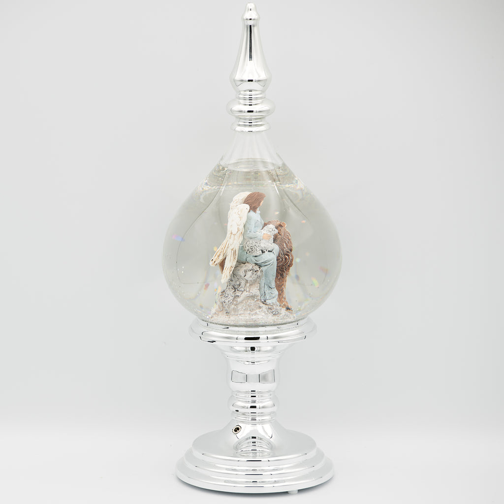 This graceful lighted swirl finial features an angel with a lion and lamb, symbolizing peace and harmony. Glitter swirls in the illuminated water globe-style scene, making it a serene and meaningful holiday accent.
