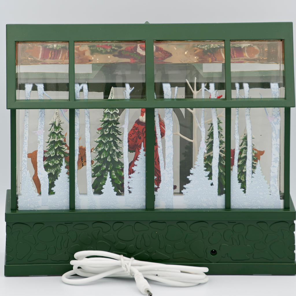 Bring the beauty of nature indoors with this lighted swirl greenhouse featuring Santa, a gentle deer, and bright red cardinals. Swirling glitter and a warm glow create a peaceful, heartwarming holiday scene.