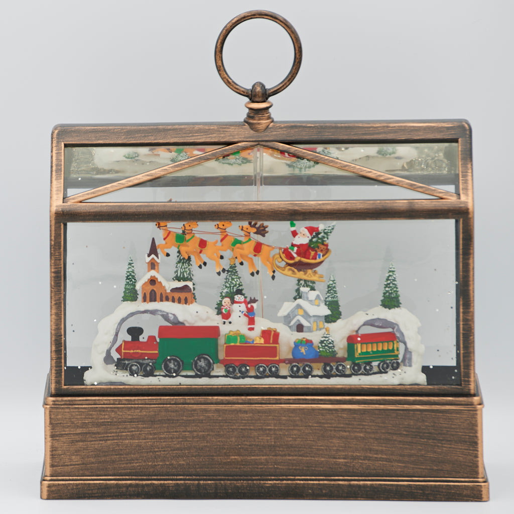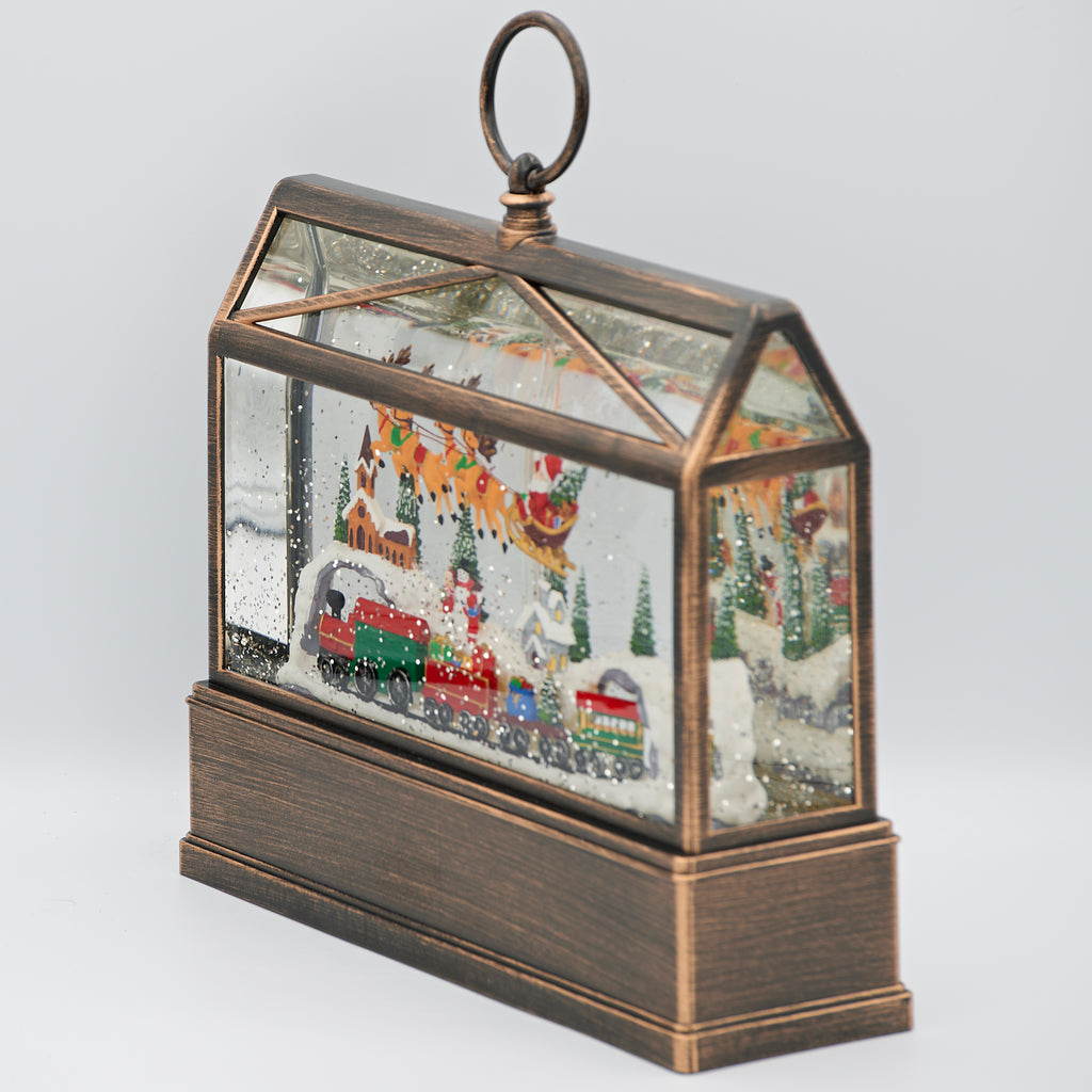 Step into a festive wonderland with this enchanting lighted swirl greenhouse. Inside, Santa is surrounded by a charming toy train and a snow-covered village, all illuminated by warm lights as glitter swirls in the air. A cozy and nostalgic holiday scene, this piece makes a beautiful addition to mantels, shelves, or seasonal displays, and a thoughtful gift for Christmas collectors.