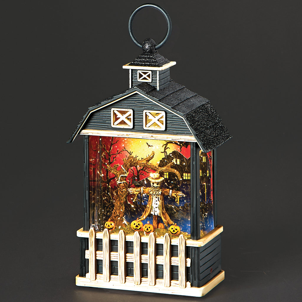 Add eerie charm to your Halloween décor with this lantern featuring a haunted barn scene complete with a sinister scarecrow and glowing jack-o’-lanterns. Swirling glitter fills the illuminated display, creating a spooky yet captivating effect. This versatile piece is perfect for tabletops, mantels, or entryways.