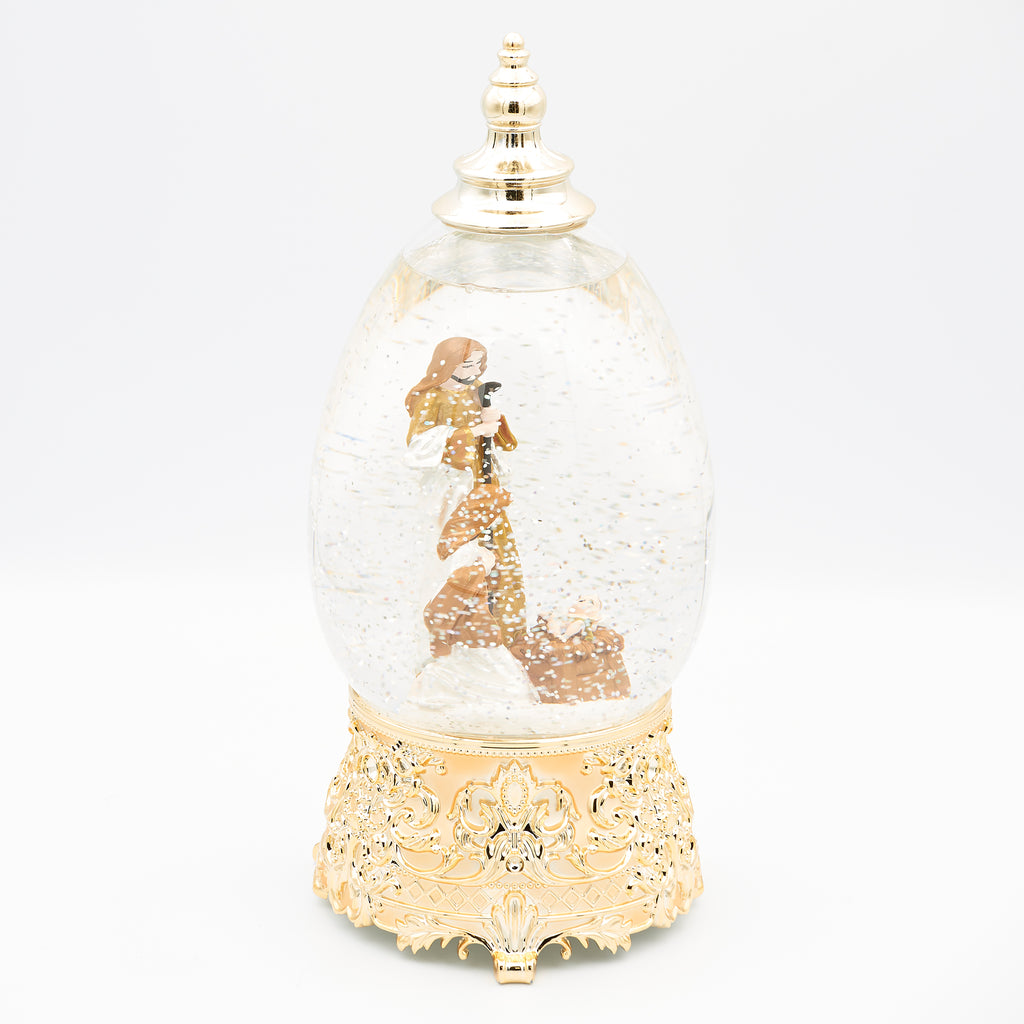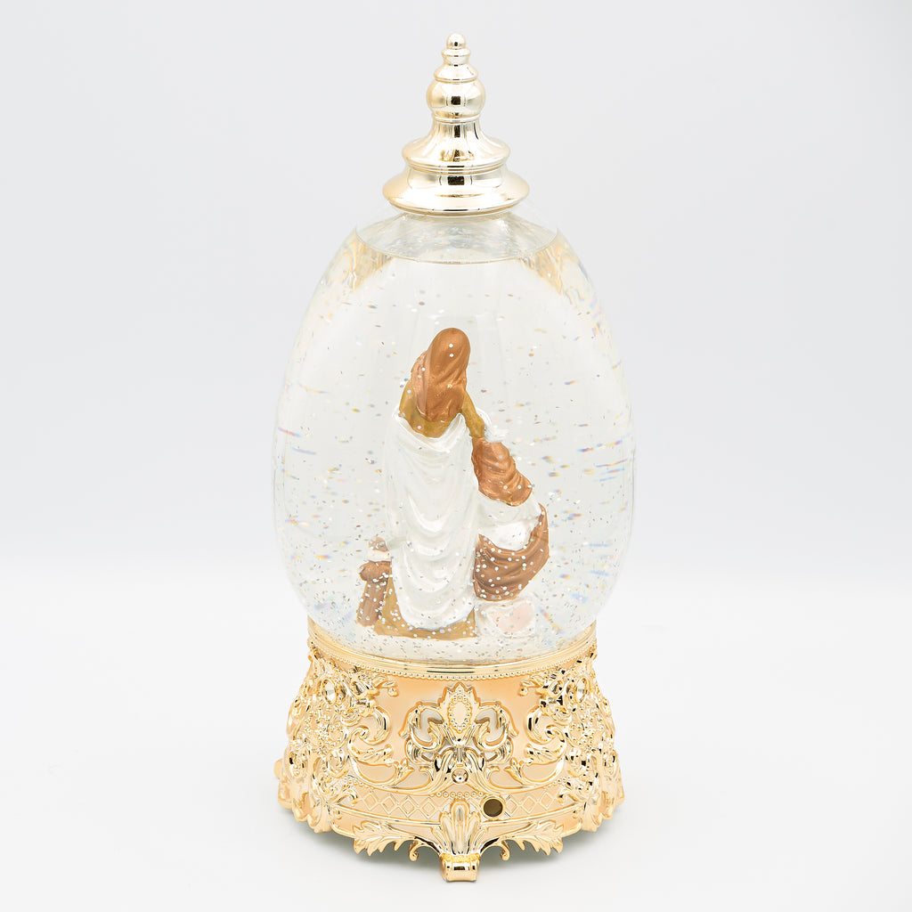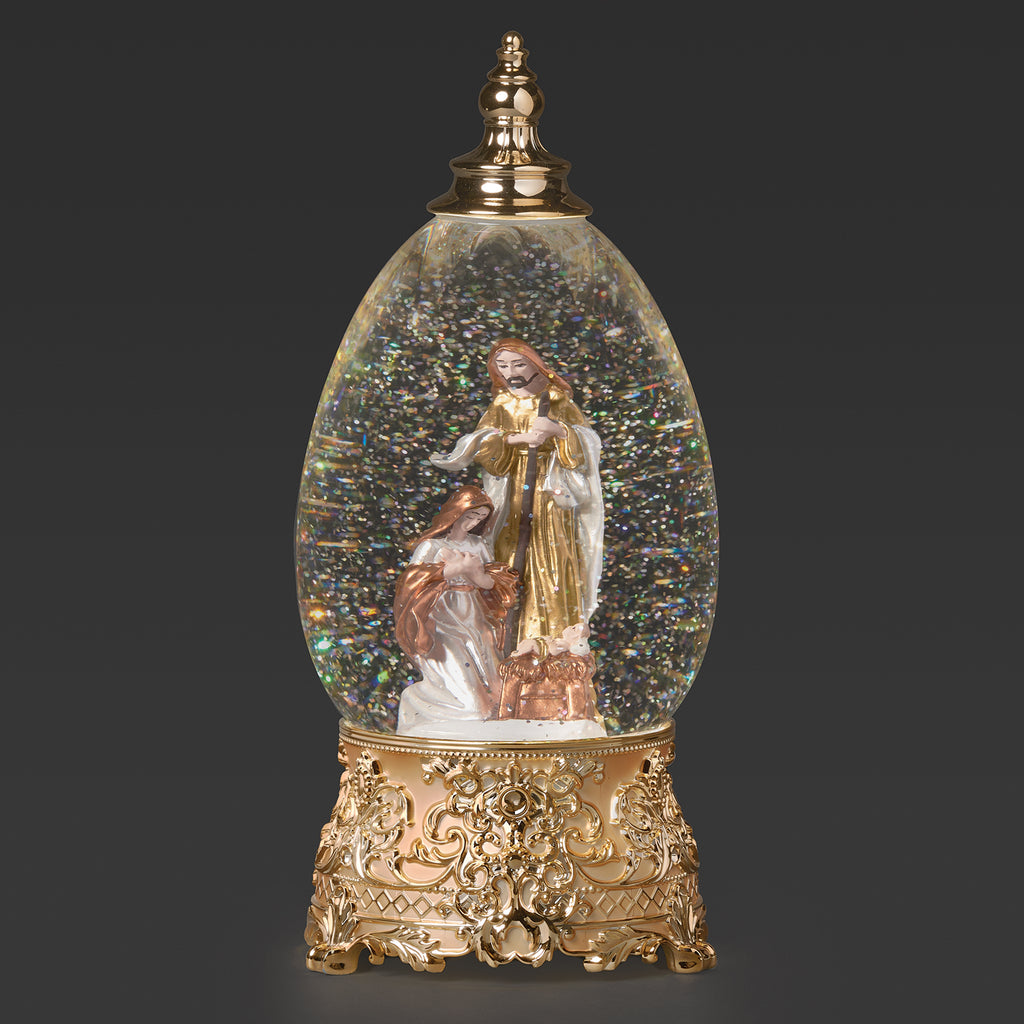 This lighted swirl display features the Holy Family enclosed in an elegant egg-shaped dome. Swirling glitter and soft light create a graceful, reverent atmosphere perfect for holiday inspiration.