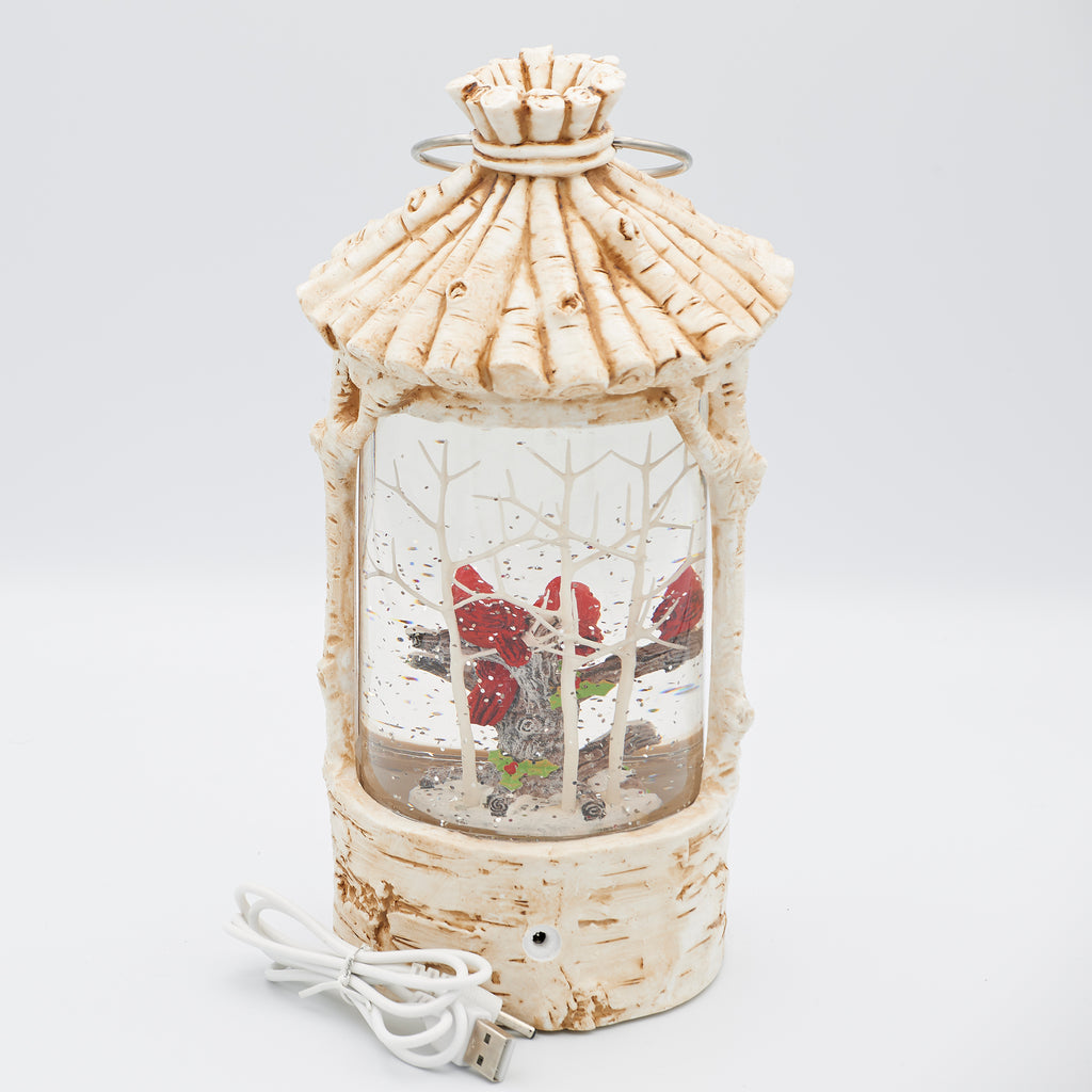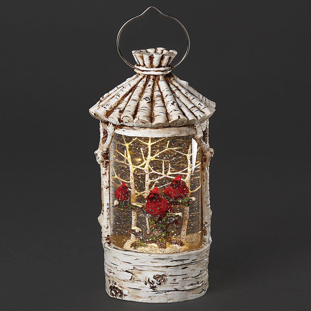 This lighted swirl lantern features a bright red cardinal framed in a rustic birch-look casing. Swirling glitter and warm light enhance the natural beauty of this peaceful winter scene.