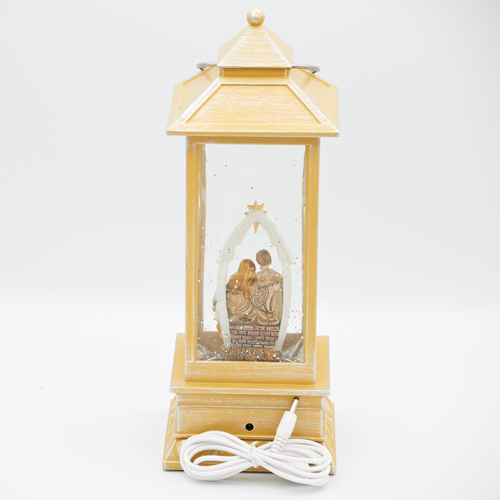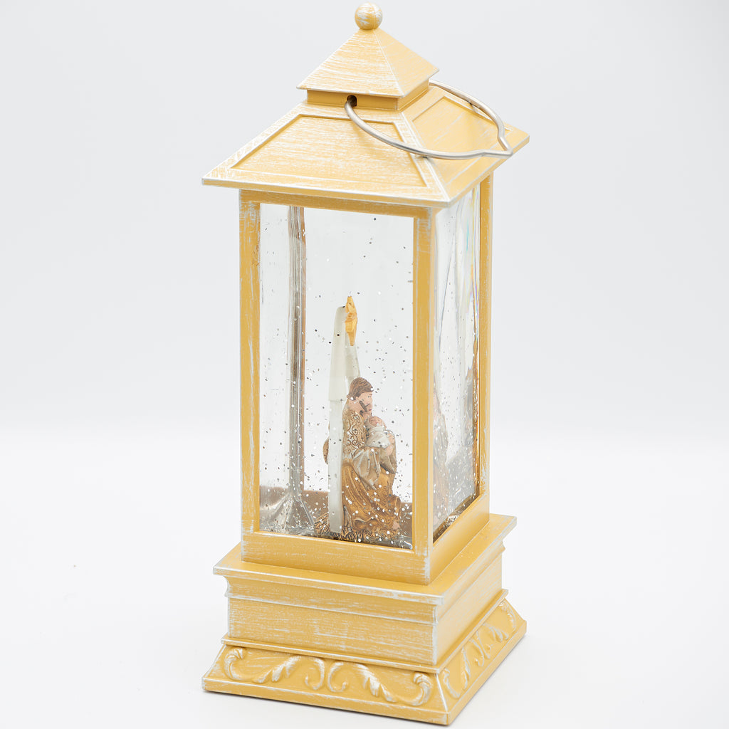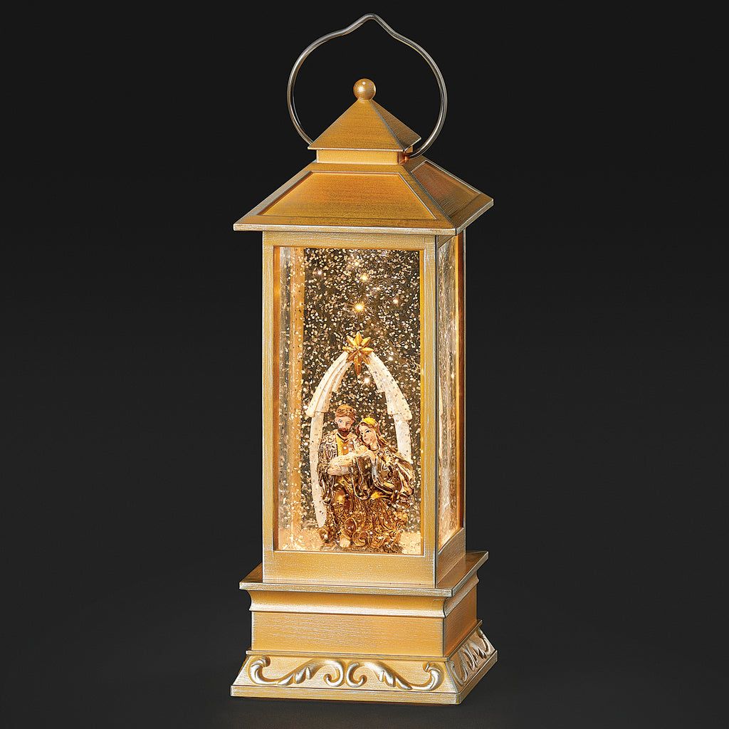This lighted swirl lantern showcases the Holy Family beneath a graceful gold arch. Swirling glitter and soft illumination highlight the scene, adding elegance and reverence to your holiday display.