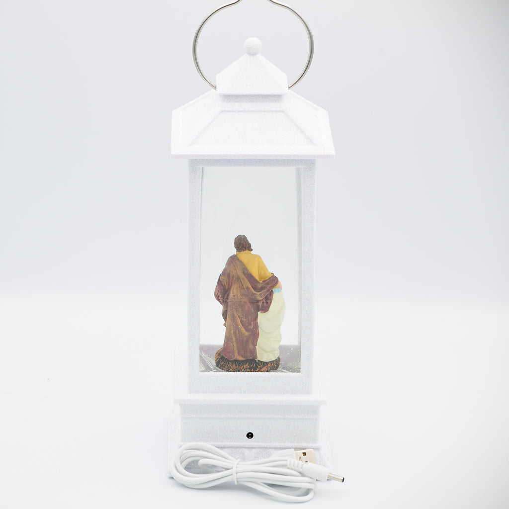 This lighted swirl lantern features the Holy Family in a serene all-white design. Illuminated by soft lights and swirling glitter, it brings a peaceful and elegant presence to your holiday display.