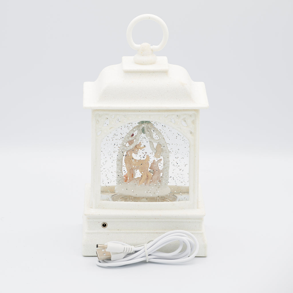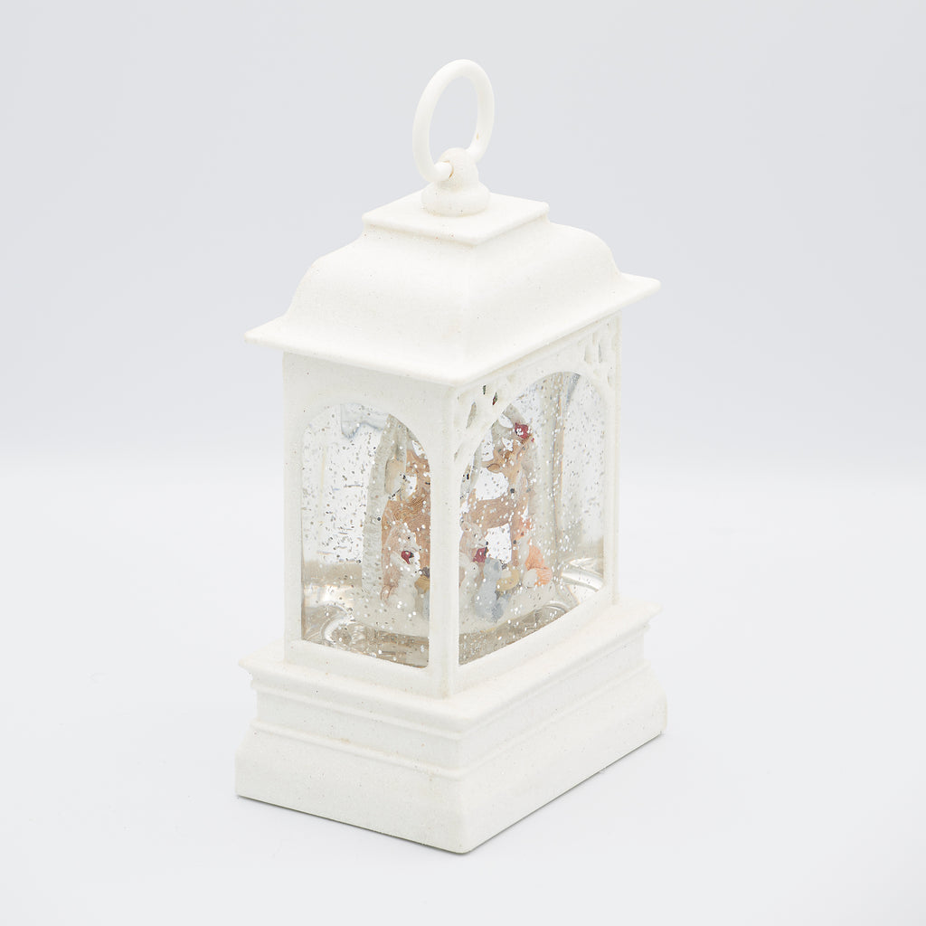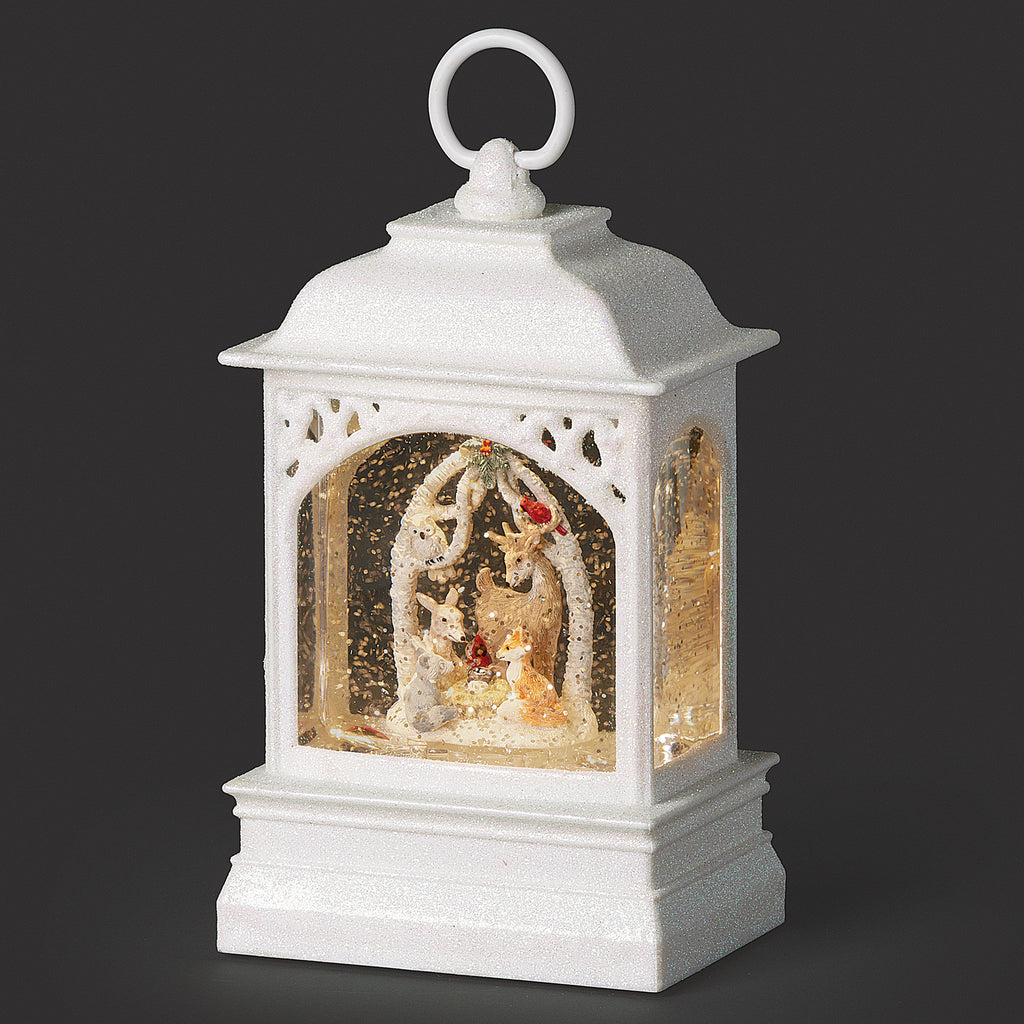 This white lighted swirl lantern showcases a serene woodland pageant scene. With gently swirling glitter and a soft glow, it brings a touch of nature and wonder to your winter or holiday display.