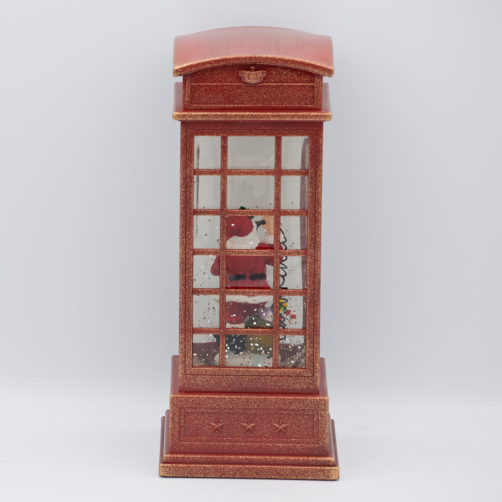 Bring vintage charm to your holidays with this festive lighted swirl phone booth. Santa stands inside as glitter sparkles around him in the glow of warm light, creating a nostalgic Christmas scene full of character. A unique accent for mantels, tabletops, or seasonal displays, it adds a touch of old-world cheer to your holiday décor.