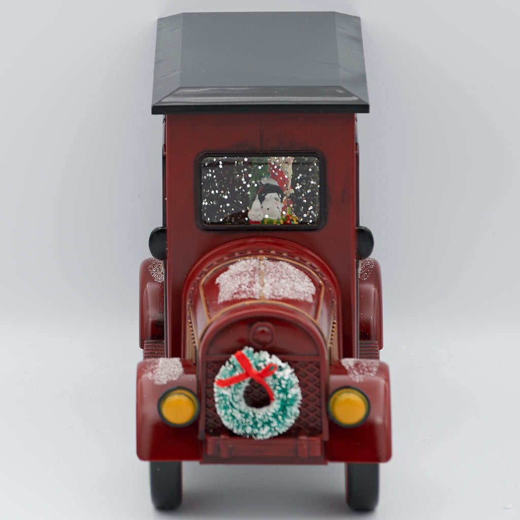 Bring holiday nostalgia to life with this festive lighted swirl delivery truck. Through the windows, Santa and a cheerful snowman are surrounded by gifts and a decorated Christmas tree, while glitter swirls in the glow of warm light. A charming accent that blends vintage style with Christmas cheer, it’s perfect for mantels, shelves, or seasonal displays.