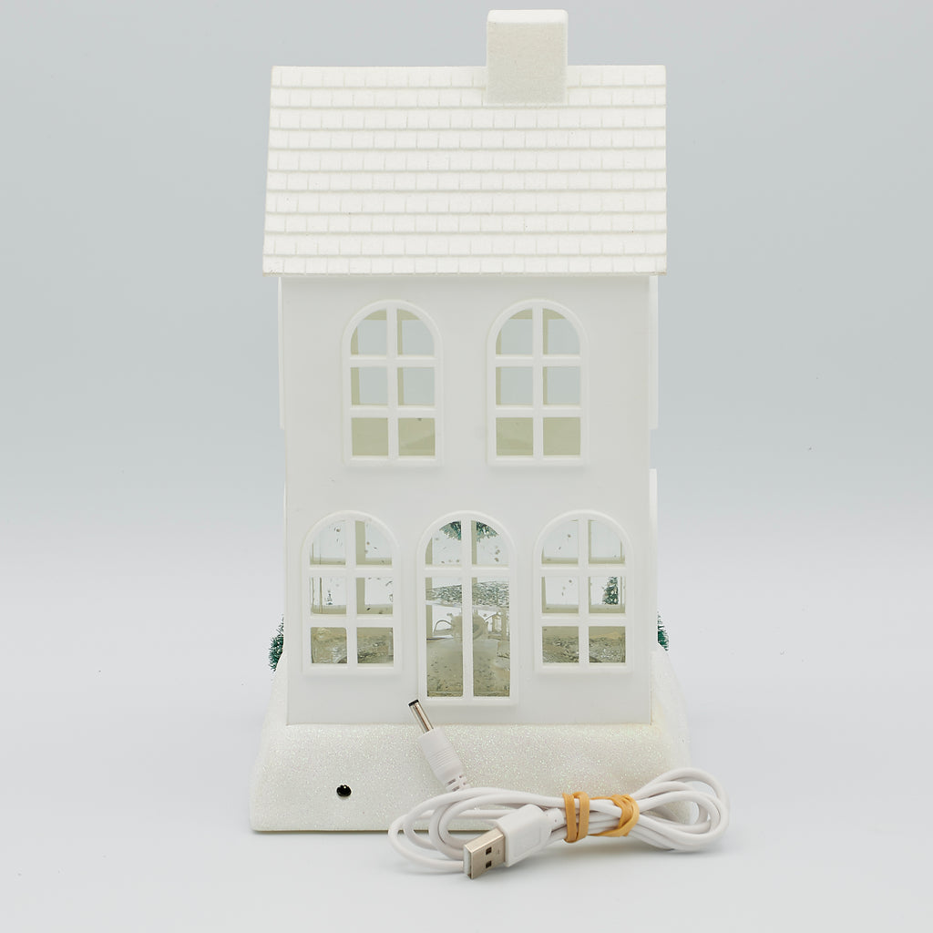 A charming 2-story white house with swirling glitter, holiday wreath, and snowy trees. Its soft glow brings a peaceful winter ambiance to mantels, shelves, or village scenes.