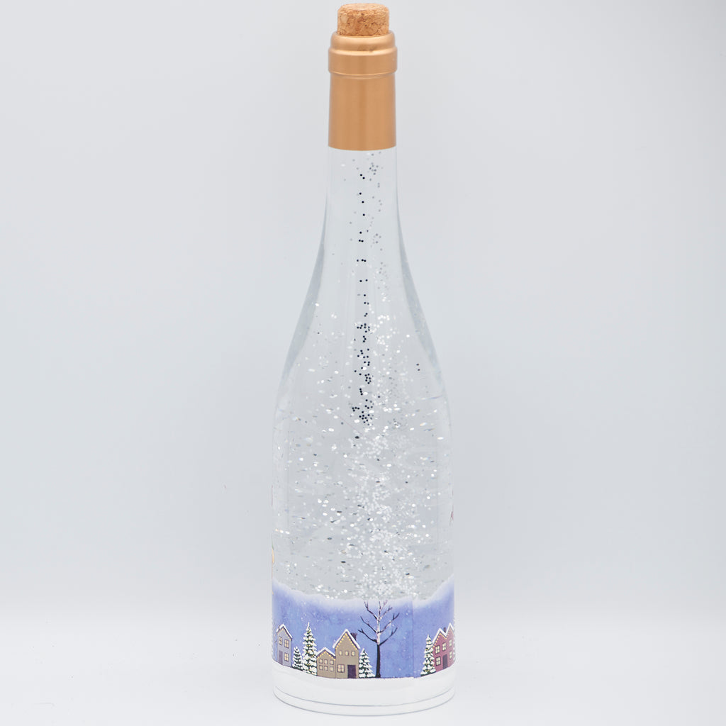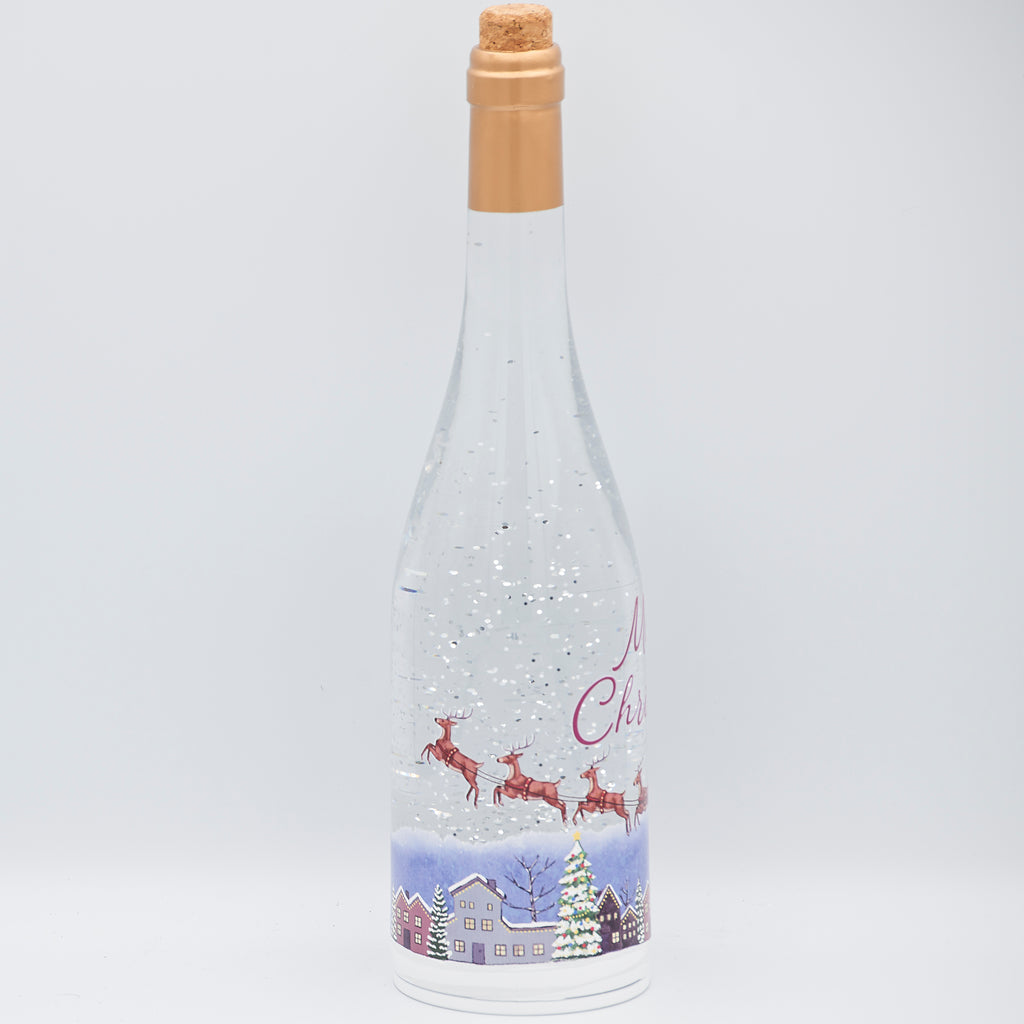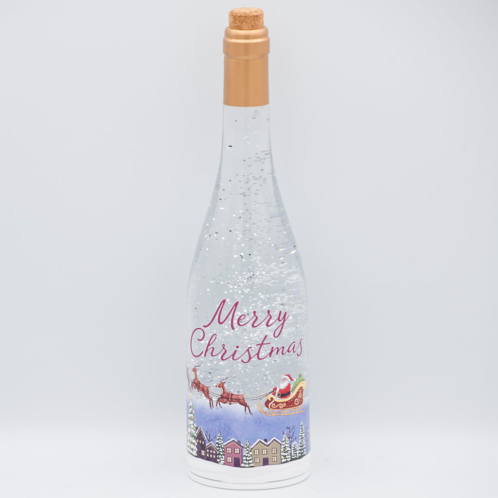 Add elegance and wonder to your holiday décor with this 12" lighted swirl Confetti Lite. Encased in a wine bottle-shaped design, the scene features Santa flying over a snow-covered town as glitter sparkles and warm light creates a magical glow. A distinctive piece that blends sophistication with festive charm, it’s perfect for mantels, shelves, or as a unique holiday gift.
