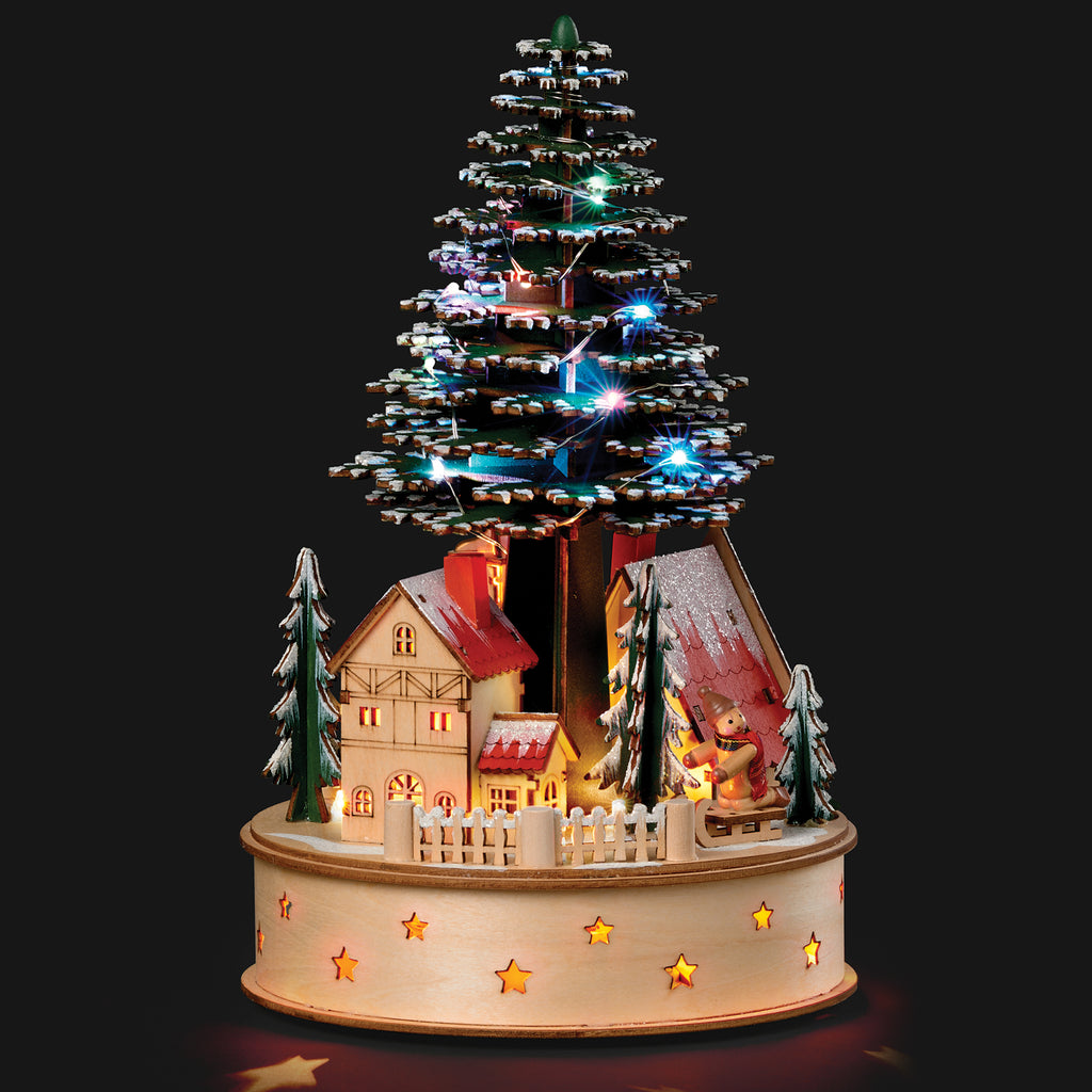 Bring the charm of a festive village into your home with this wooden town center scene. A glowing Christmas tree stands at the heart of the display, lighting up the wooden buildings with holiday warmth. Ideal for shelves or mantels.