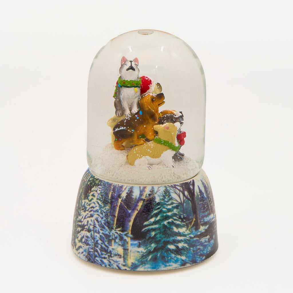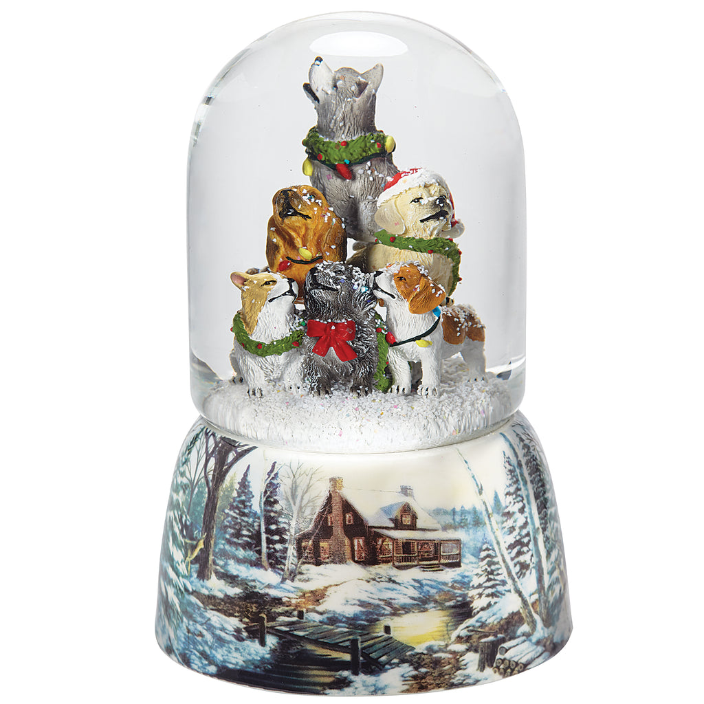 Add holiday fun to your décor with this resin and glass musical waterglobe. Inside, a group of festive puppies in holiday wreaths gather together in a joyful howl, while the base features a charming snowy cottage scene. Simply wind it up to hear “Deck the Halls” and enjoy the cheerful spirit it brings. A delightful keepsake, perfect for gifting to dog lovers or adding to your holiday collection.