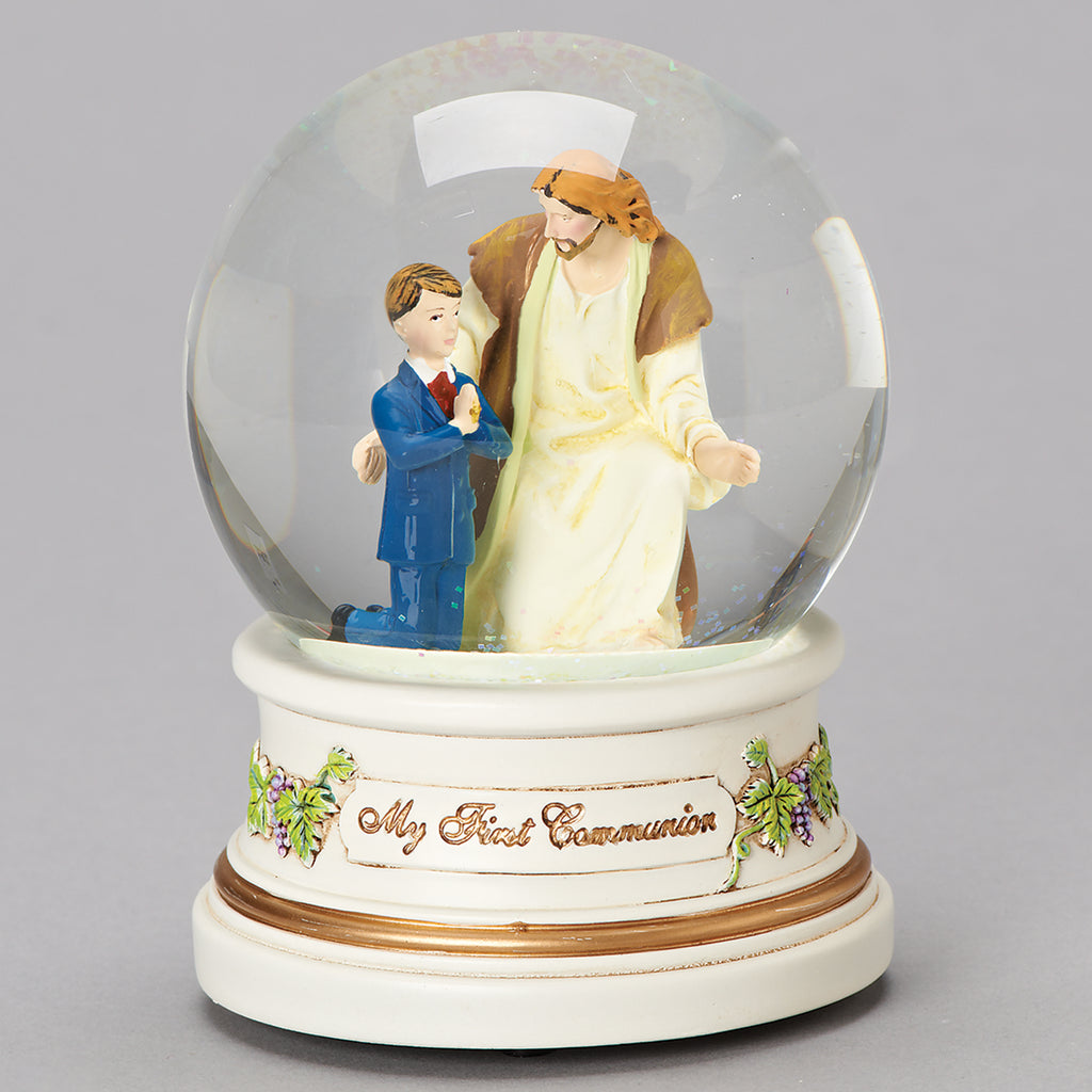 This First Communion waterglobe is a touching keepsake that captures the meaning of the sacrament in a beautiful scene. Inside the glass dome, a boy in a blue suit kneels prayerfully before Jesus, symbolizing reverence and devotion on this important day. The base is finished with gold trim, grapevine accents, and the inscription “My First Communion,” adding to its significance and charm. When wound, the globe plays a hymn, filling the moment with peaceful reflection. A treasured keepsake, this musical waterglobe is both decorative and deeply meaningful.