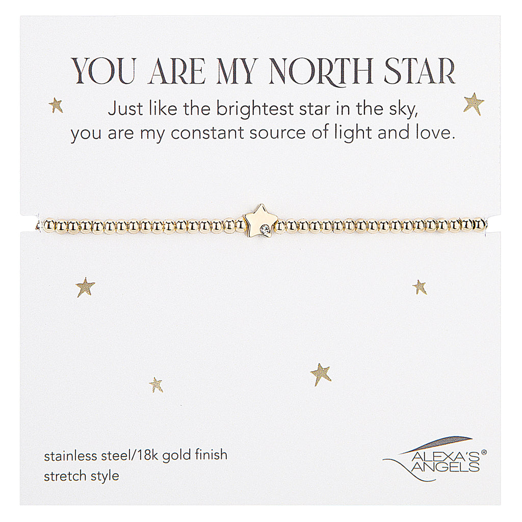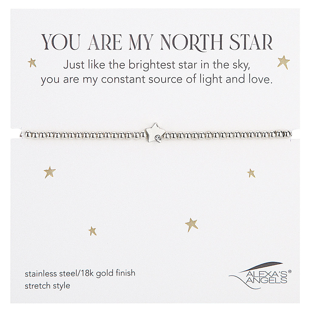 Celebrate the guiding light in your life with the "You Are My North Star" Stretch Bracelet. Featuring a delicate star charm accented with a single sparkling crystal, this elegant bracelet serves as a heartfelt reminder of someone who brings you direction, love, and constant support. Available in gold or silver finish and designed with a comfortable stretch fit, it's a meaningful gift for a loved one‚ or a sentimental keepsake just for you.