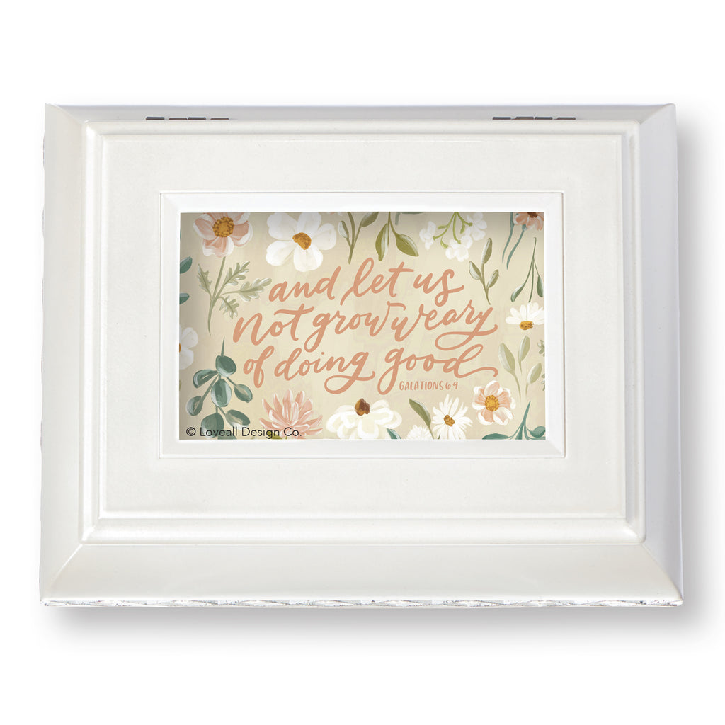 This elegant white music box from the Allison Loveall Collection is a timeless keepsake of faith and encouragement. Featuring delicate floral artwork and the Scripture verse “And let us not grow weary of doing good” (Galatians 6:9), it combines beauty with inspiration. Perfect for moments of reflection, encouragement, or as a thoughtful gift for loved ones.
