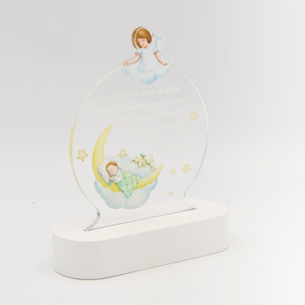 Bring peace and comfort to bedtime with this glowing acrylic display. Featuring the cherished prayer “Now I lay me down to sleep,” it depicts a guardian angel watching over a sleeping child nestled on a crescent moon. Gently illuminated with a soft, warm light, this piece creates a soothing presence for nurseries, baptisms, or as a meaningful gift of faith and reassurance.