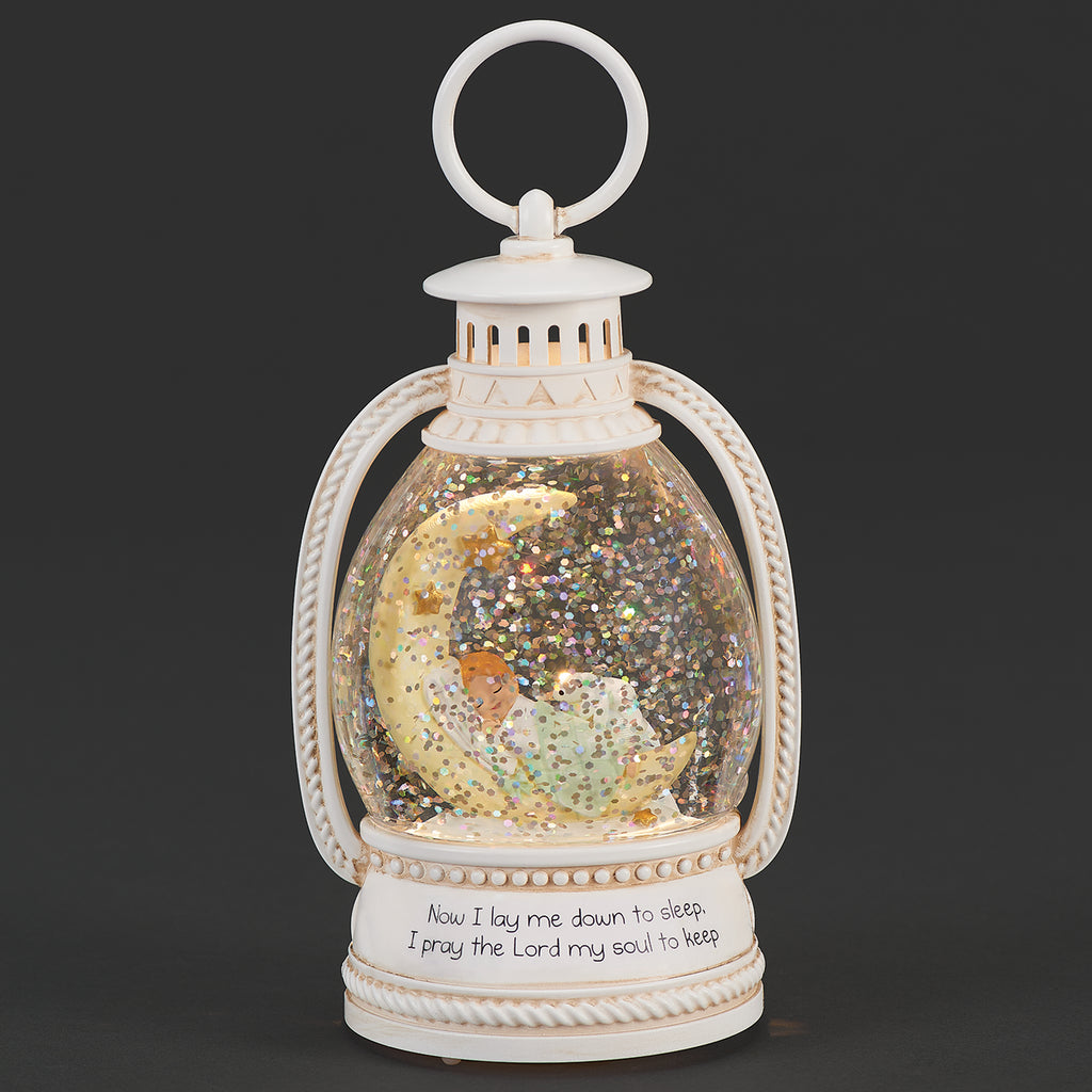 This enchanting shimmer lantern features a peaceful child resting on a crescent moon, surrounded by swirling glitter and illuminated with soft LED light. The base is inscribed with the beloved prayer: “Now I lay me down to sleep, I pray the Lord my soul to keep.” A comforting and faith-filled accent for nursery décor, it also makes a meaningful baptism or baby shower gift, inspiring peace and devotion at bedtime.