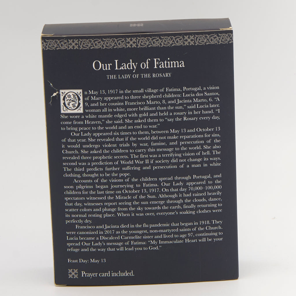 This beautifully detailed Our Lady of Fatima figure from the Patrons & Protectors Collection commemorates the Marian apparition that called the world to peace, penance, and prayer. Depicted in serene elegance with folded hands and rosary, she serves as a powerful reminder of Mary’s message of hope and conversion. A cherished devotional for prayer spaces, personal reflection, or as a meaningful gift of faith for loved ones.