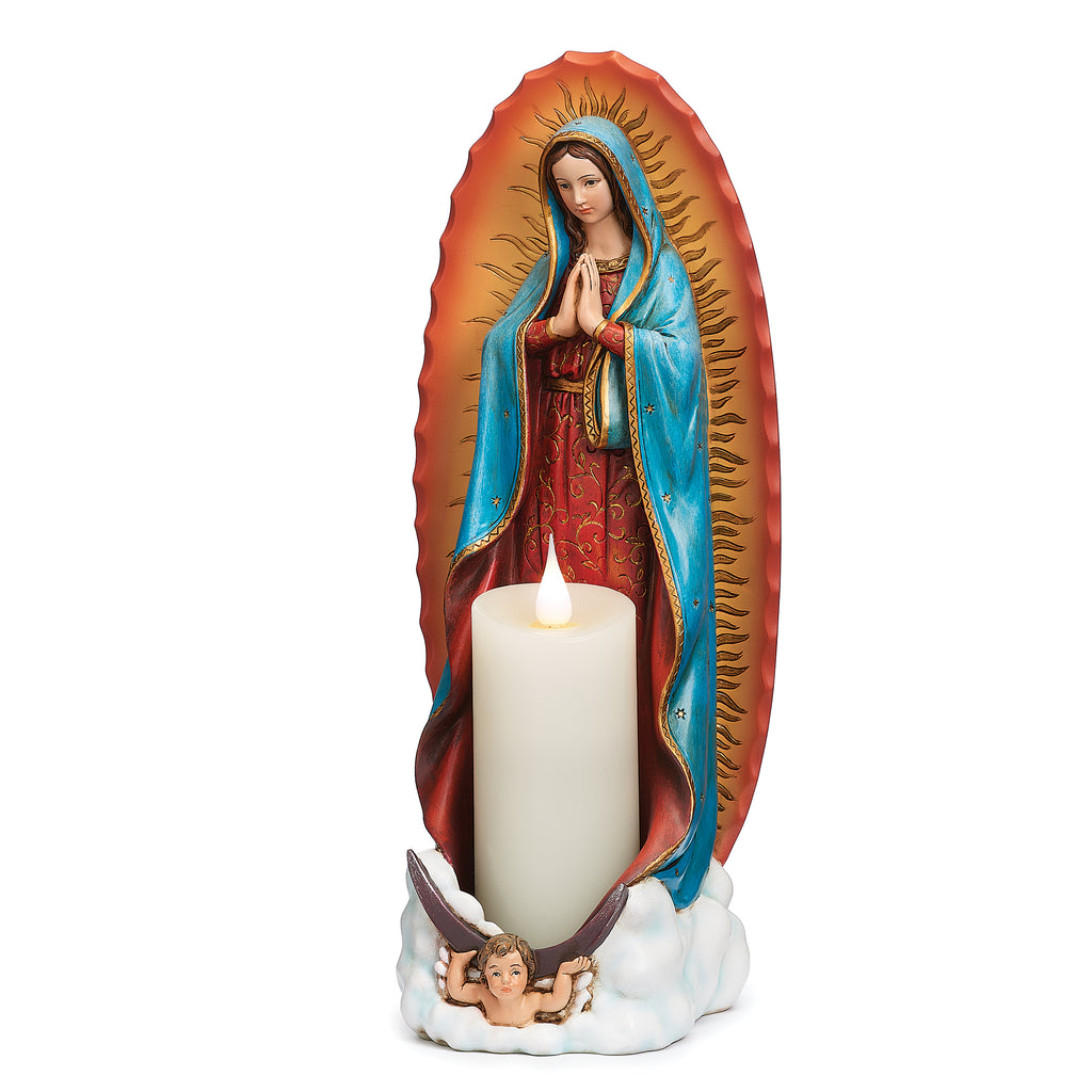 Honor the Blessed Mother with this beautifully detailed Our Lady of Guadalupe statue. Hand-painted in rich, vibrant colors, this piece captures the radiant beauty and grace of Mary’s apparition. A recessed holder at the base fits a standard pillar candle (not included), allowing soft light to illuminate this sacred scene. Perfect for altars, prayer corners, or as a meaningful devotional gift.