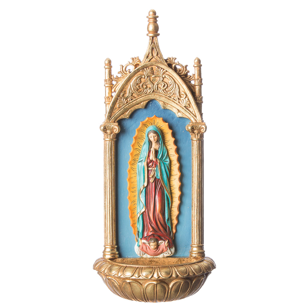 This Holy Water Font features a stunning image of Our Lady of Guadalupe within an ornate shrine-like frame. It's perfect for holding holy water near doorways, in chapels, or anywhere you seek the Virgin Mary's loving protection.