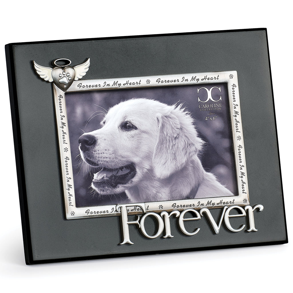 Celebrate the cherished memory of a beloved companion with this elegant memorial frame from the Caroline Collection. The border is inscribed with the heartfelt phrase “Forever in My Heart” and accented with a metallic “Forever” at the bottom. A thoughtful piece for shelves, mantles, or desk displays, it serves as a lasting tribute of love and remembrance.