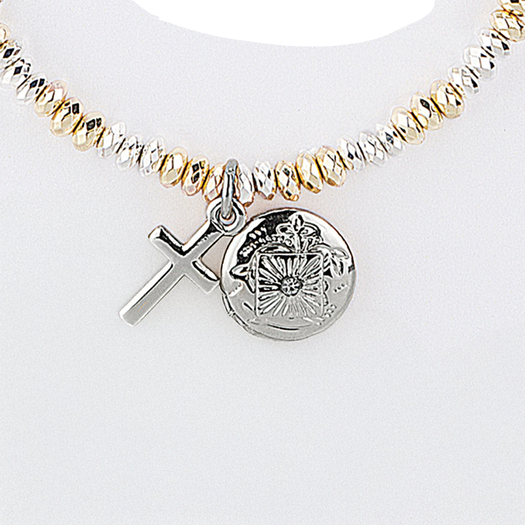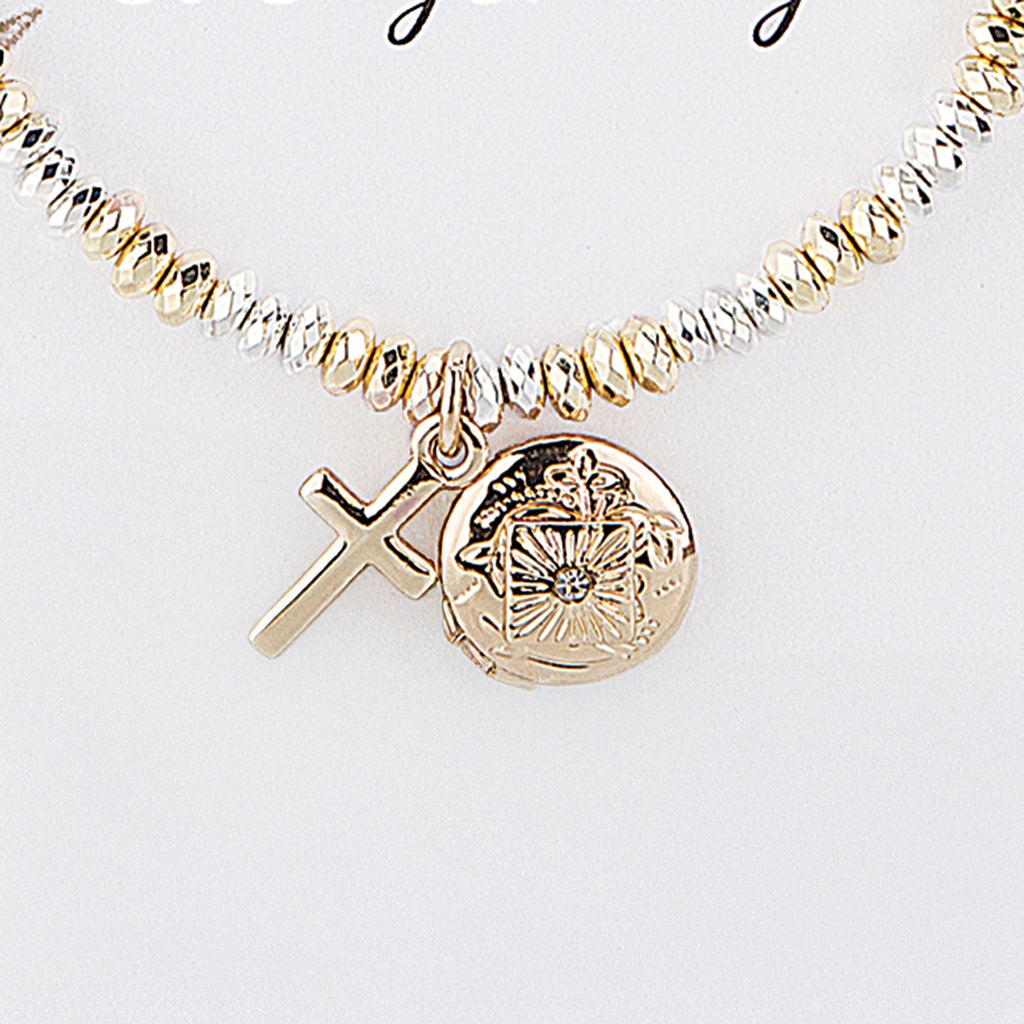 Let your faith shine with the "Prayer Changes Everything" Prayer Box Bracelet. This elegant stretch bracelet is adorned with gold and silver-toned beads and features a locket-style prayer box charm and a small cross pendant. Designed to hold a tiny note, word, or intention, it's a meaningful reminder of the power of prayer and a beautiful symbol of spiritual strength. Available in gold and silver finishes.