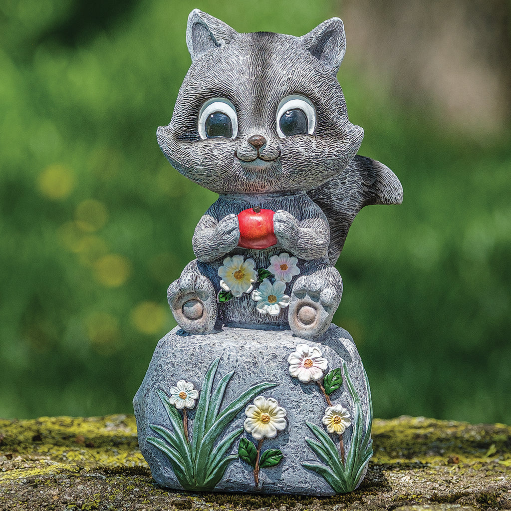 Bring woodland charm to your outdoor décor with this Raccoon on Stone Garden Statue. Holding a bright red apple and sitting atop a flower-accented stone base, this playful design adds personality and warmth to any yard. Perfect for garden beds, rustic displays, or walkways, it combines a mischievous look with weather-resistant durability for long-lasting appeal.